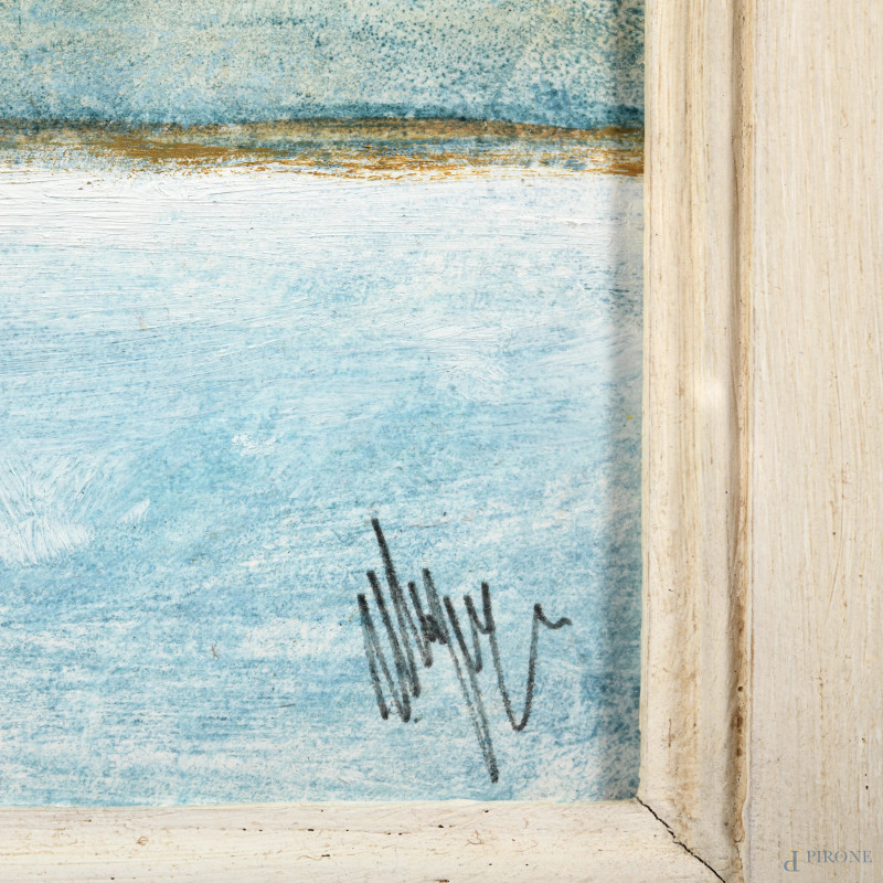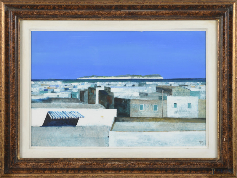 Salvatore Magazzini (1955-), Tetti sul mare, tecnica mista su cartone pressato, cm 40x60, firmato in basso a destra, entro cornice