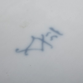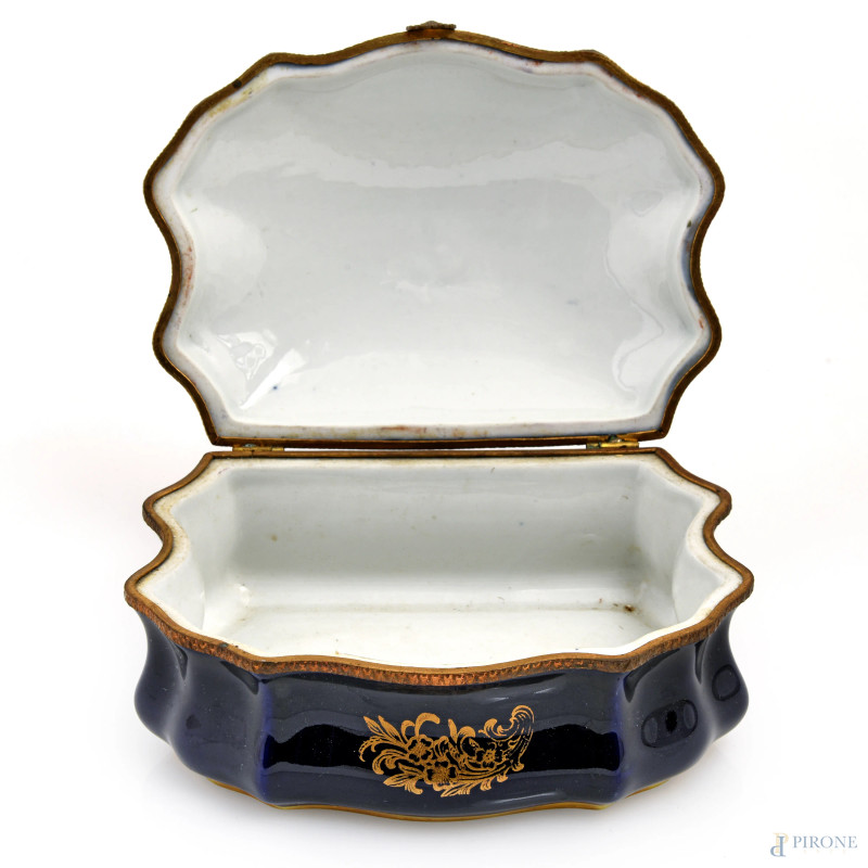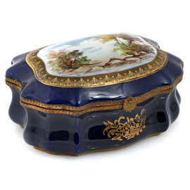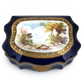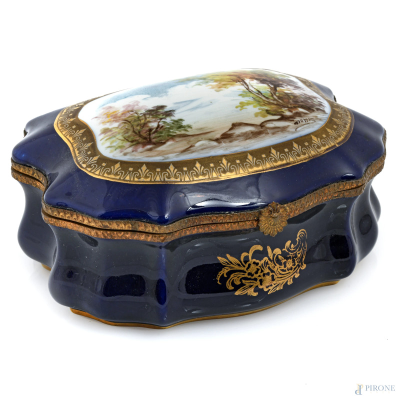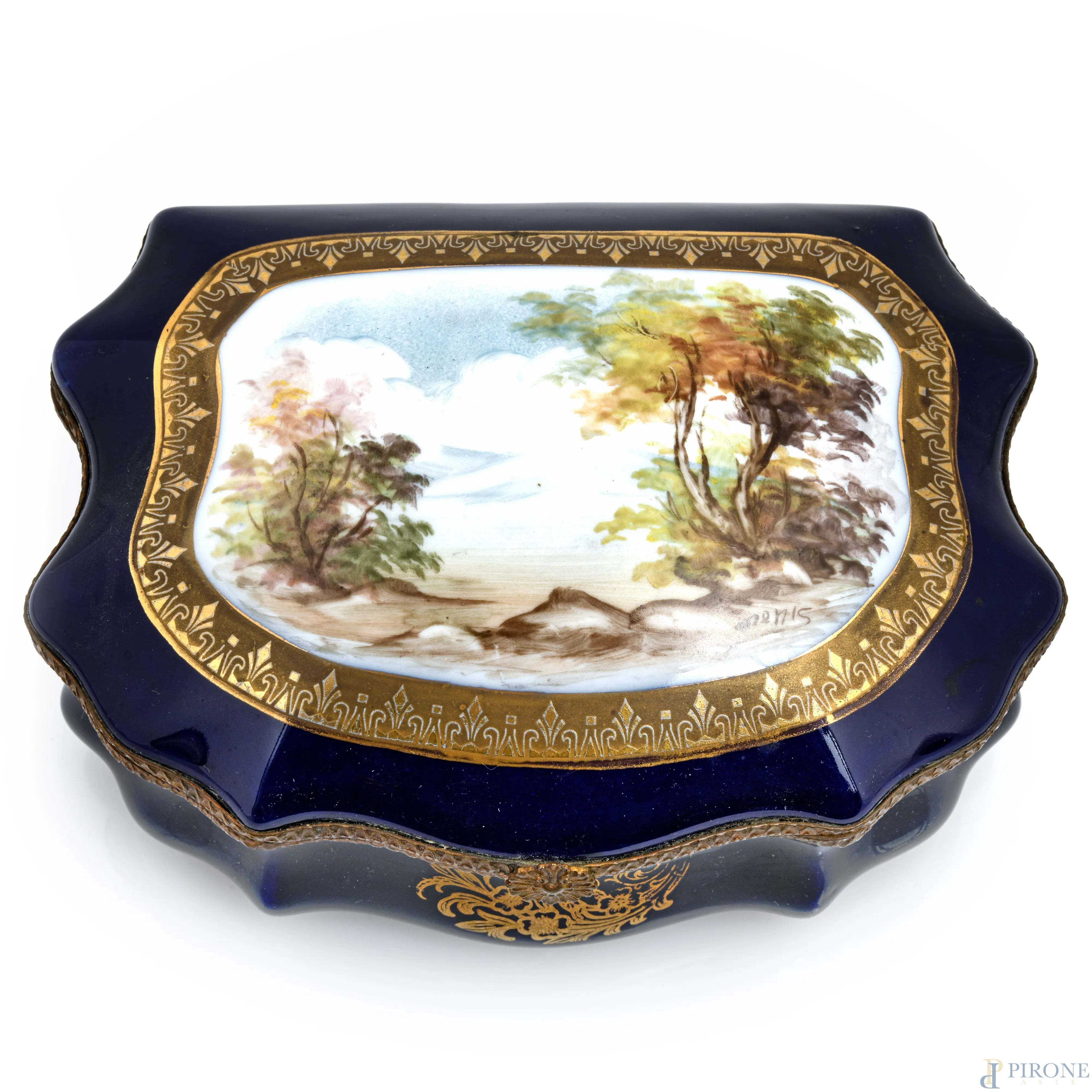 Scatola portagioie in porcellana Sevres nei toni del blu e dell'oro con scena di paesaggio al coperchio, XIX secolo, cm 9x16x12