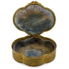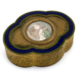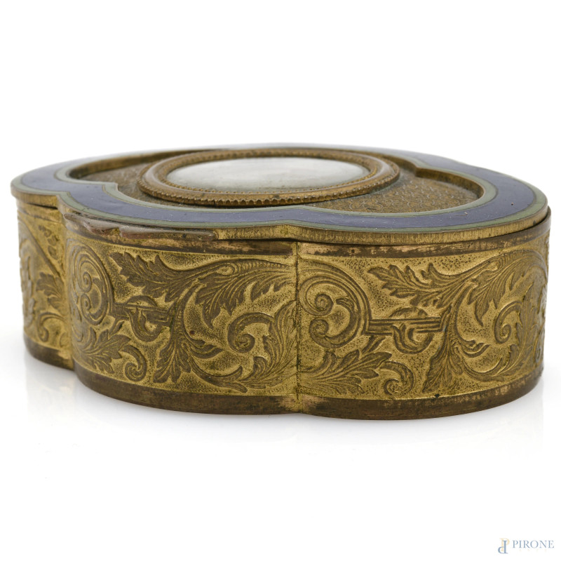 Scatolina in bronzo dorato finemente cesellato con ritratto di ufficiale a miniatura al coperchio con bordi smaltati nei toni del blu, XIX-XX, cm 3,5x10x8