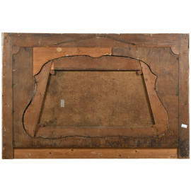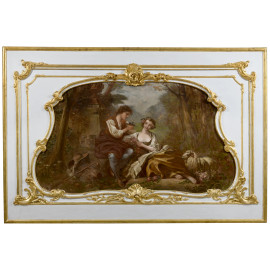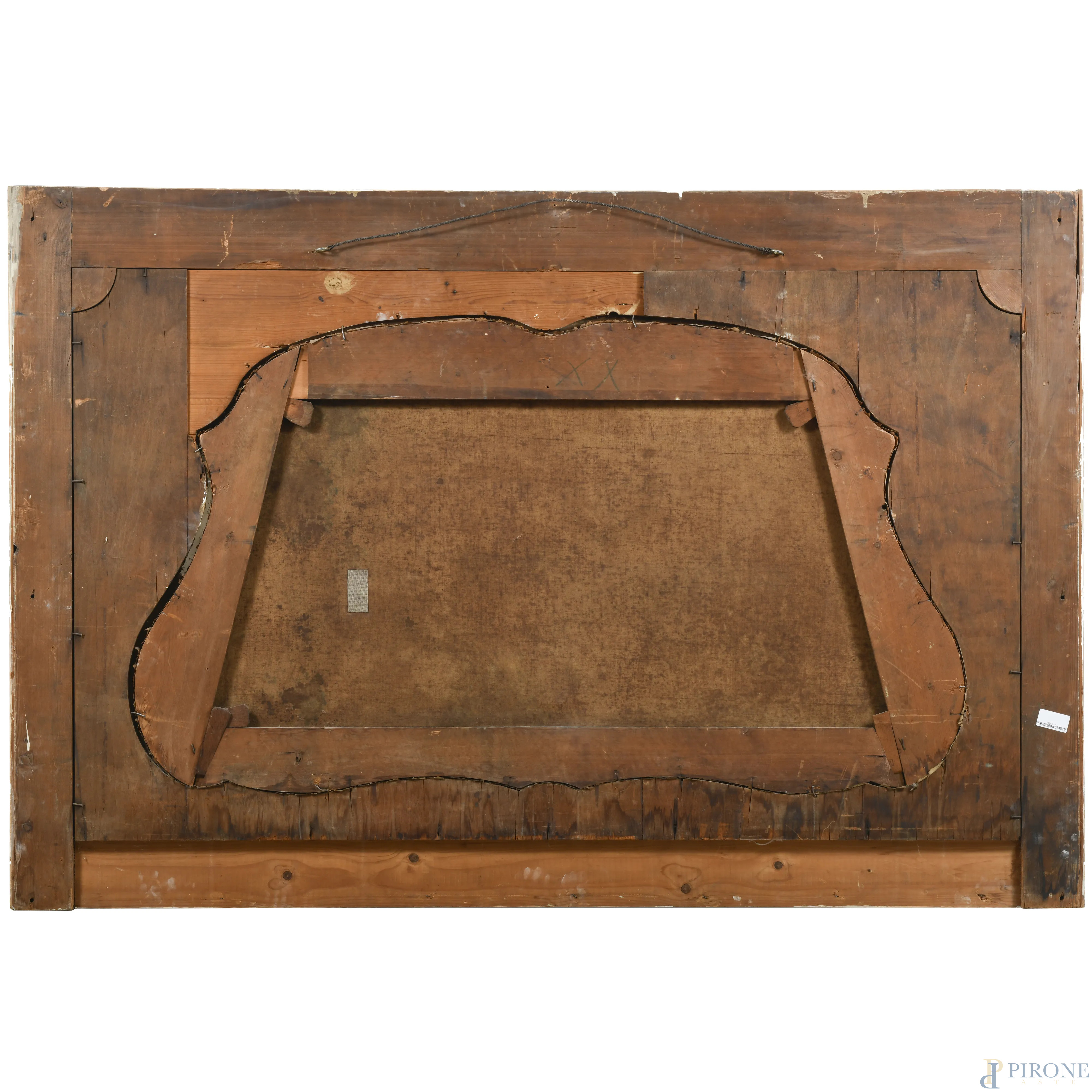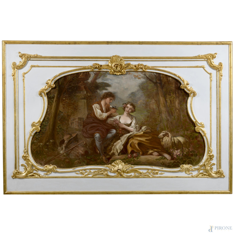 Scena galante, XIX-XX secolo, olio su tela sagomata, cm 86x150, entro cornice, cm 134x197