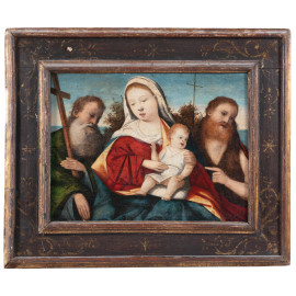 Scuola veneta del XVI secolo, Sacra Conversazione, olio su talvola, cm 36x46,5, entro cornice, (craquelure, sollevamenti di colore, restauri)