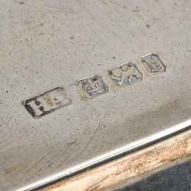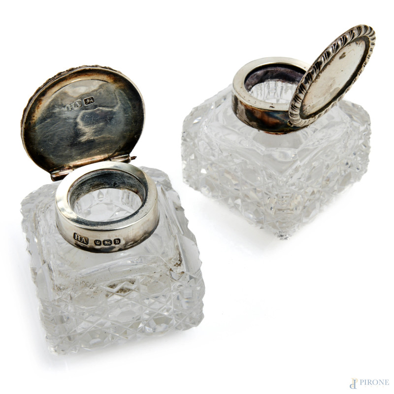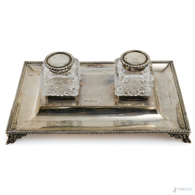 Servito da scrittoio a doppia vaschetta in argento inglese e cristallo, XX secolo, peso gr 280, cm 22,5x14