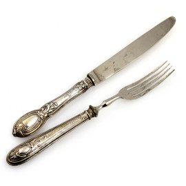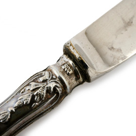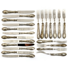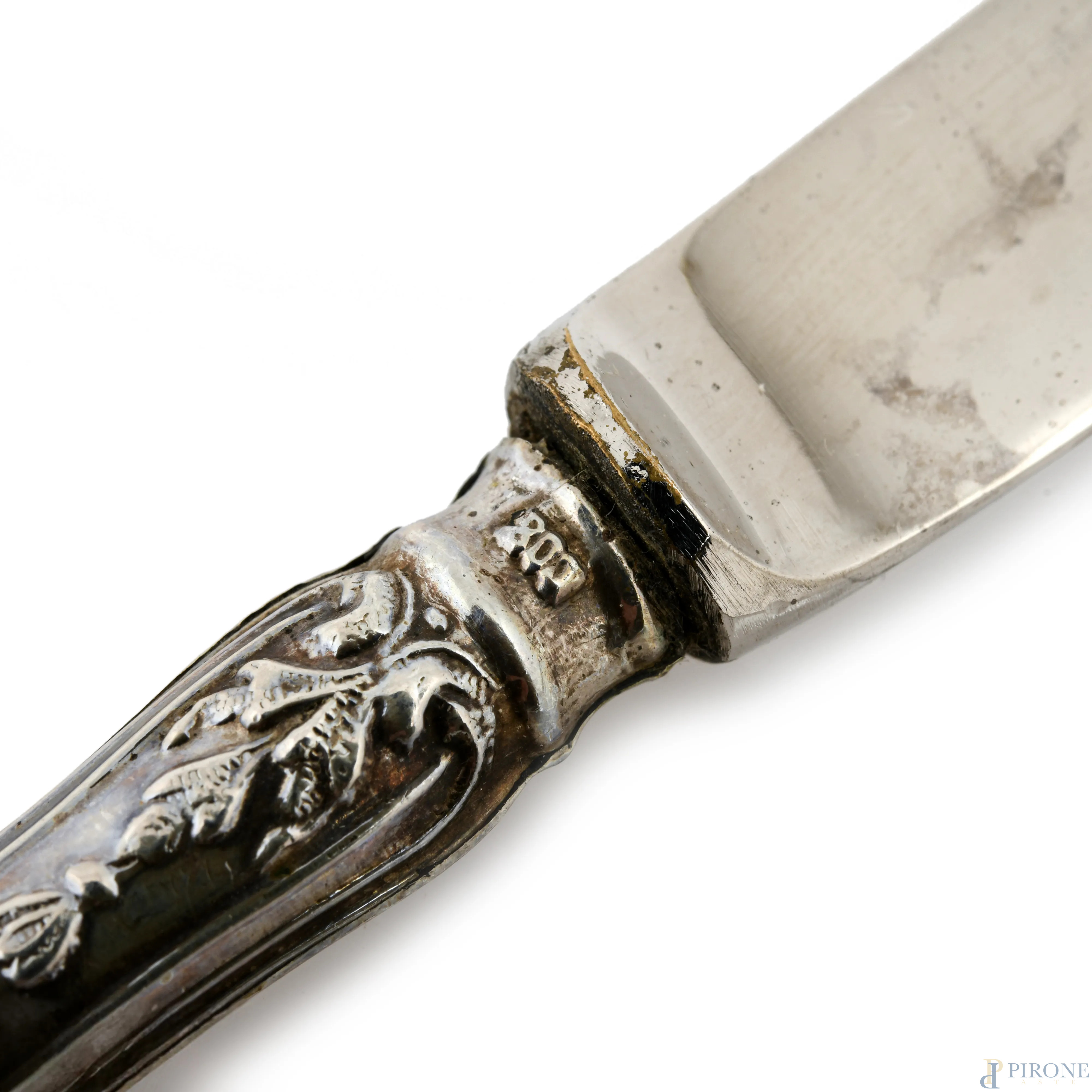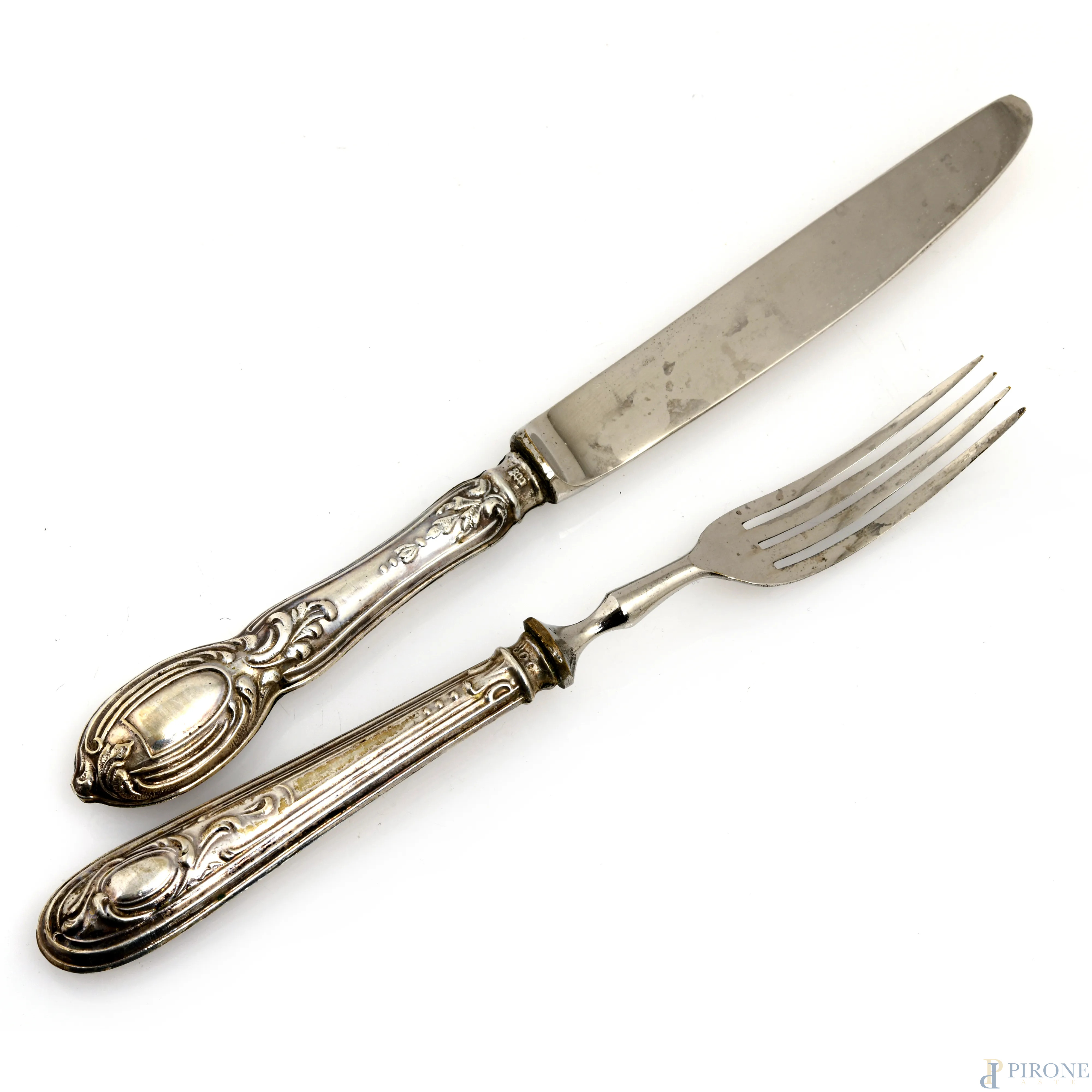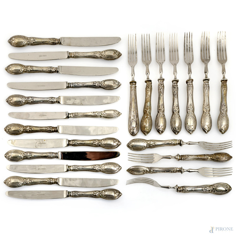 Servizio da dolce composto da 12 coltellini e 11 forchettine con manici in argento, XX secolo, lunghezza massima cm 19, (segni di usura, difetti)