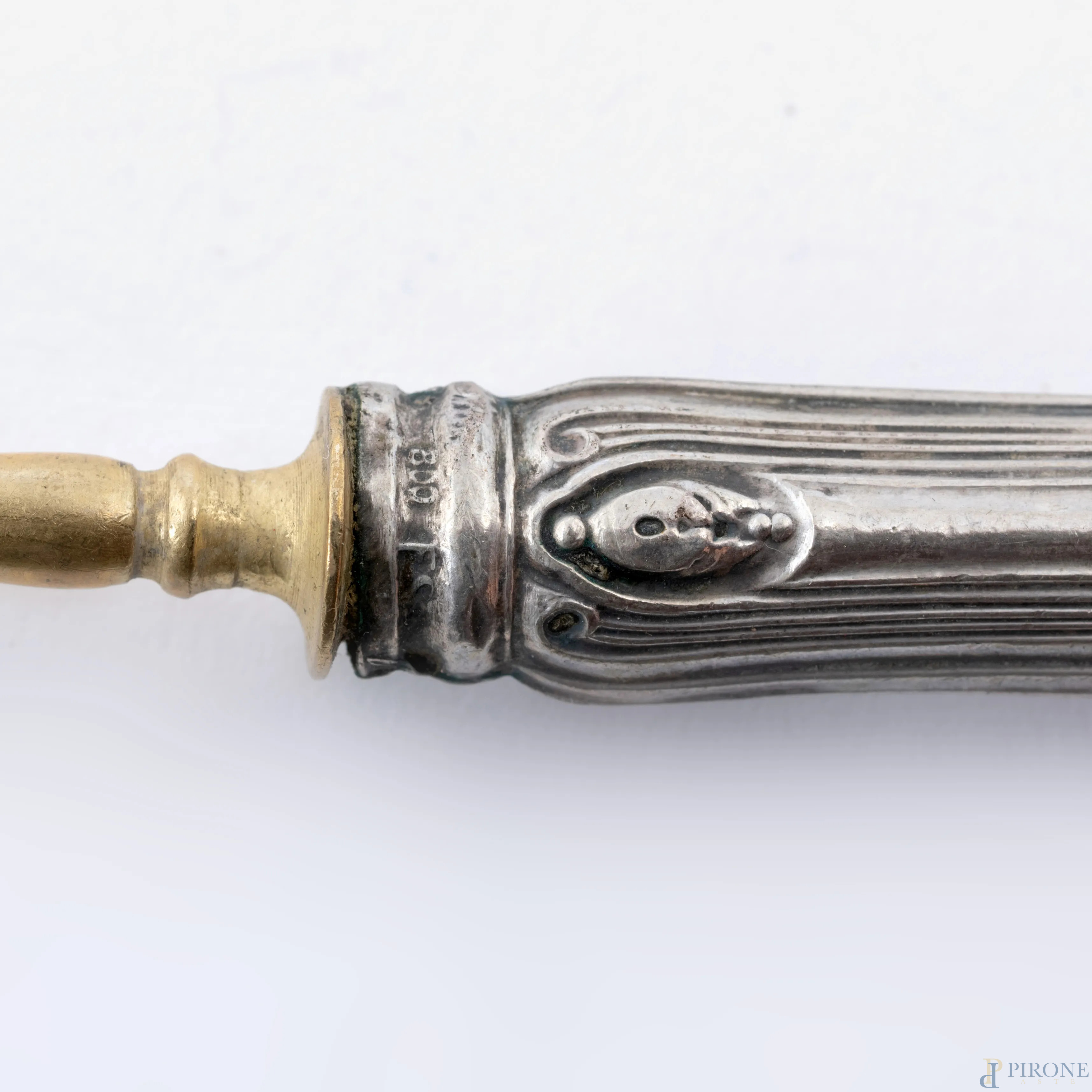 Servizio da dolce composto da sette cucchiaini e due posate da portata con manico in argento 800/000, lunghezza massima cm 28, peso lordo complessivo gr 320