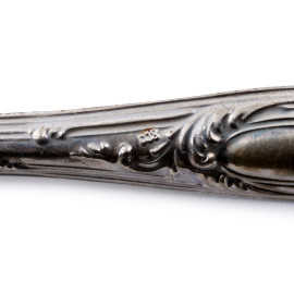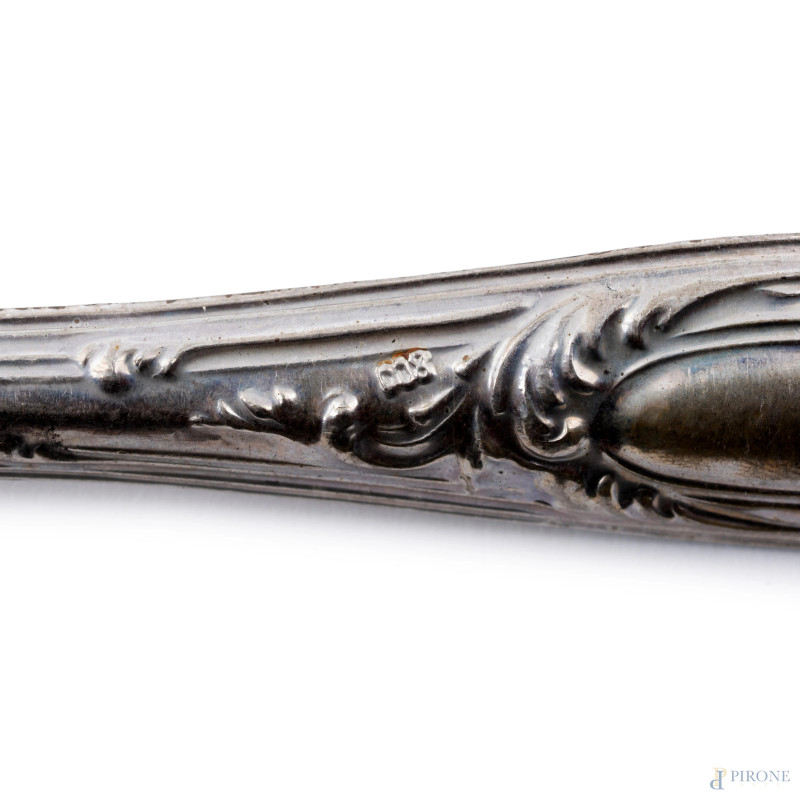 Servizio da dolce da due persone composto da due forchettine, due coltellini, due cucchiaini con manico in argento 800/000, lunghezza massima cm 19,5, peso lordo complessivo gr 150