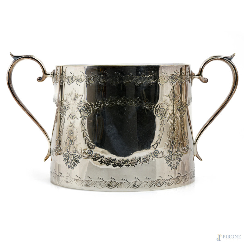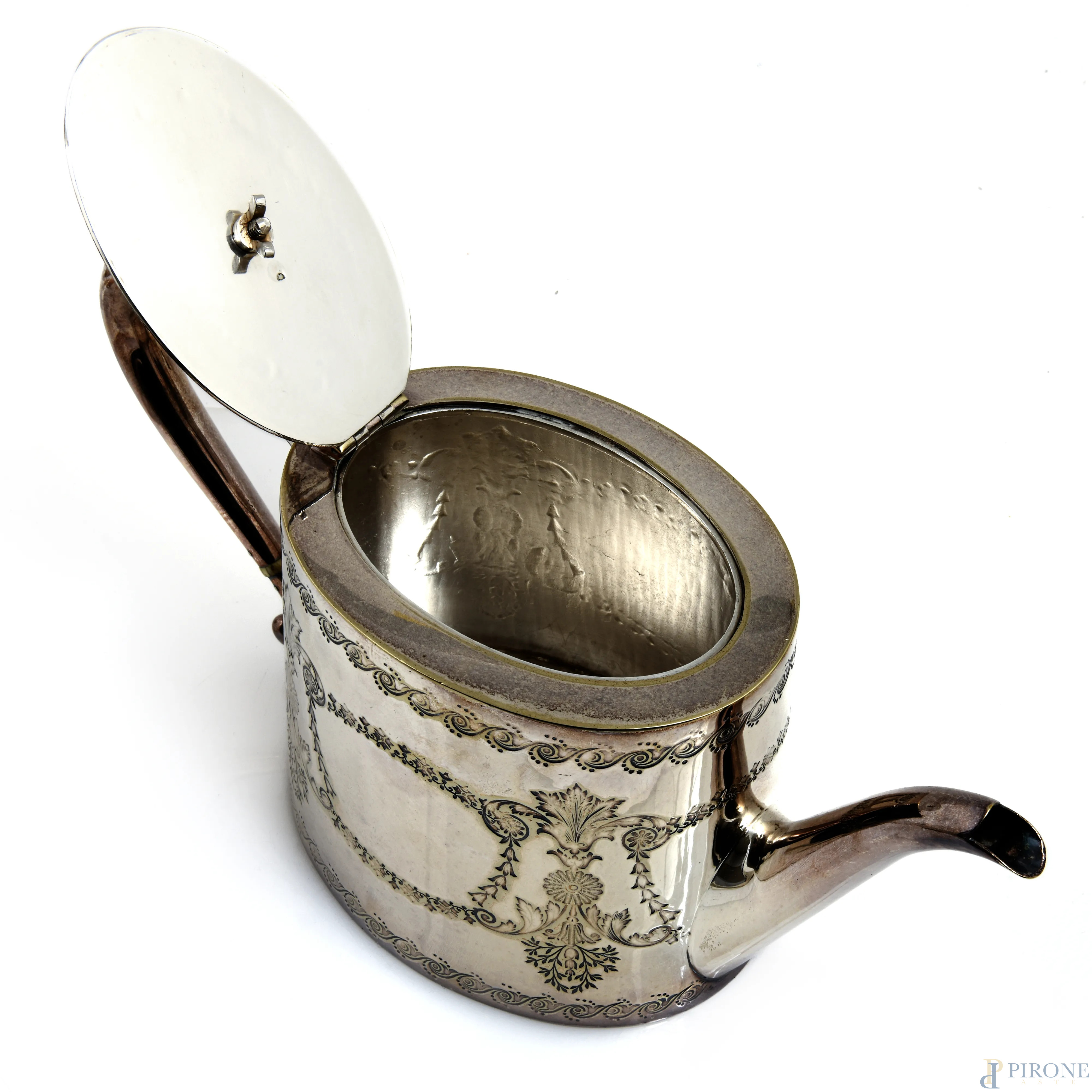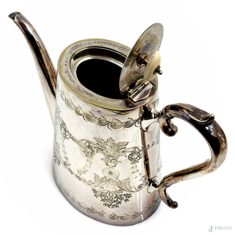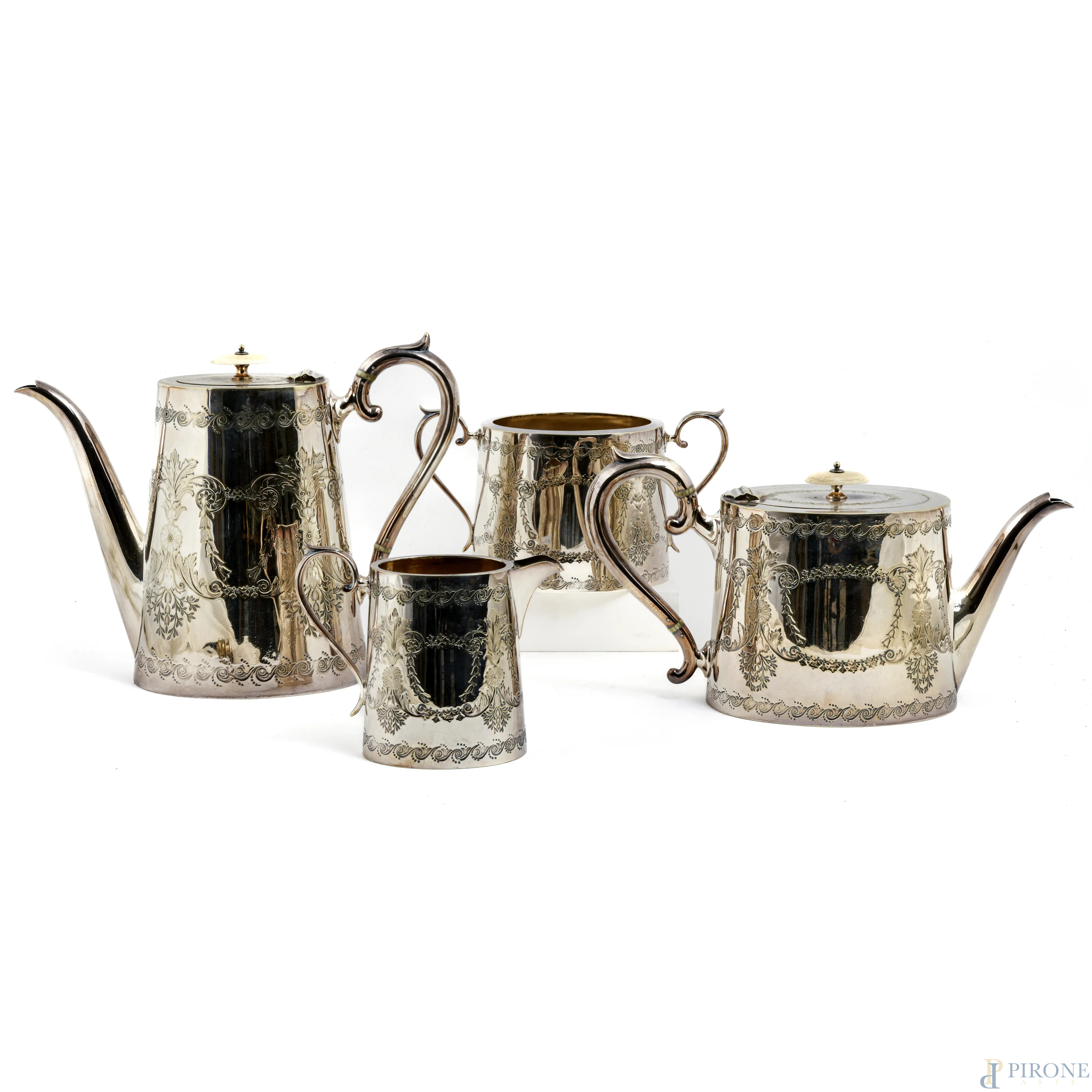 Servizio da the e caffè in metallo argentato e cesellato a motivi floreali, composto da teiera, lattiera, caffettiera e zuccheriera, XX secolo, misure massime cm 21x27x11