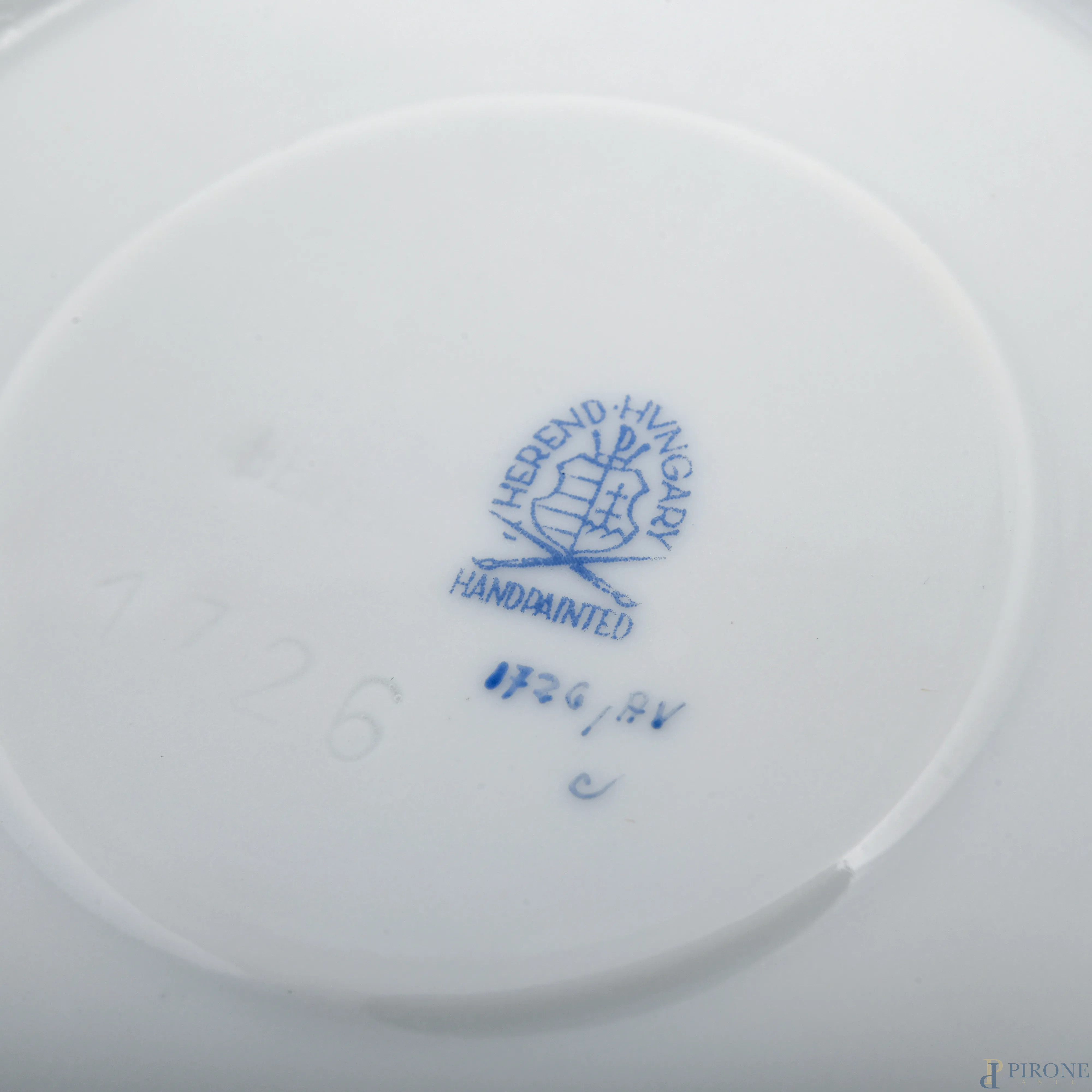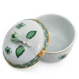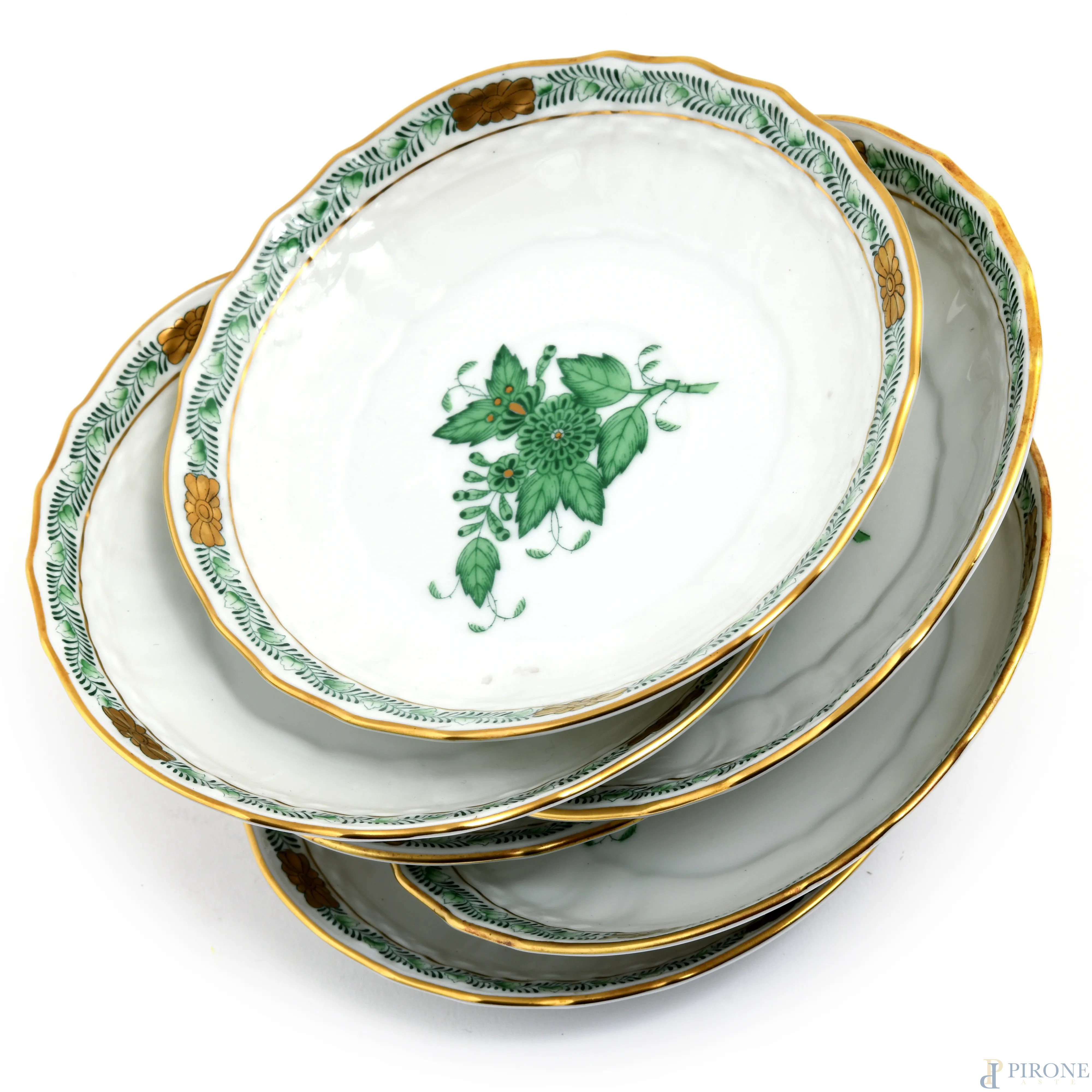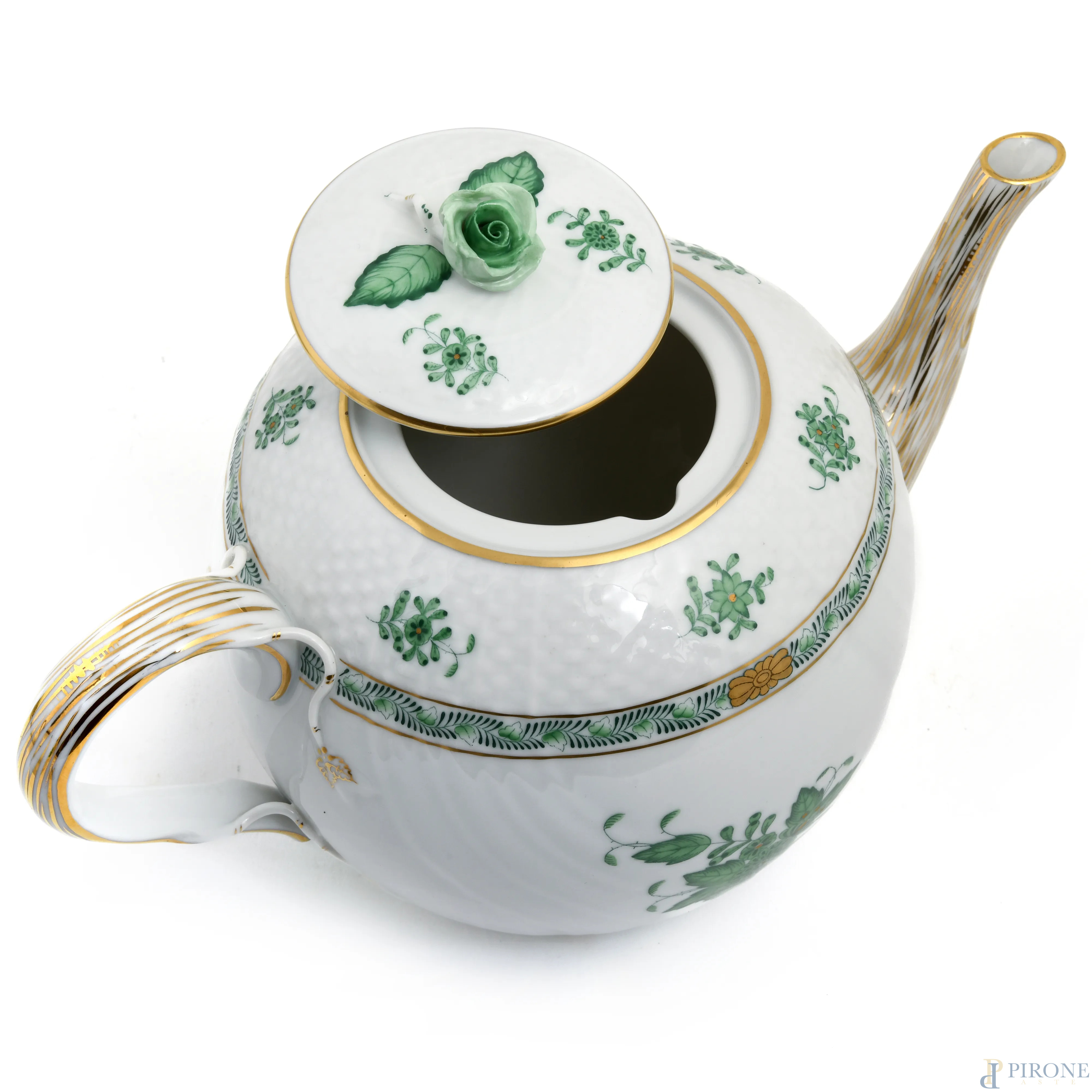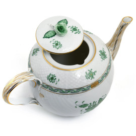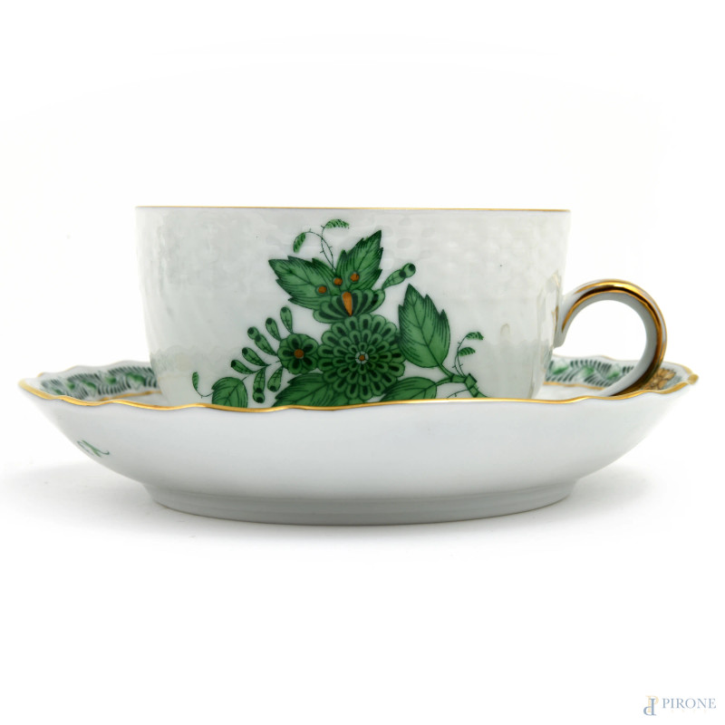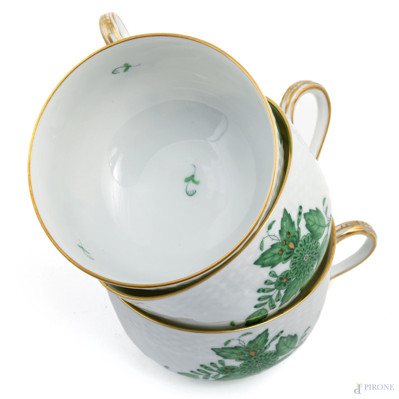Servizio da the in porcellana Herend a decori floreali verde composto da una teiera, sei piattini, sei tazzine, una zuccheriera, una lattiera,(segni di usura)