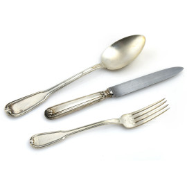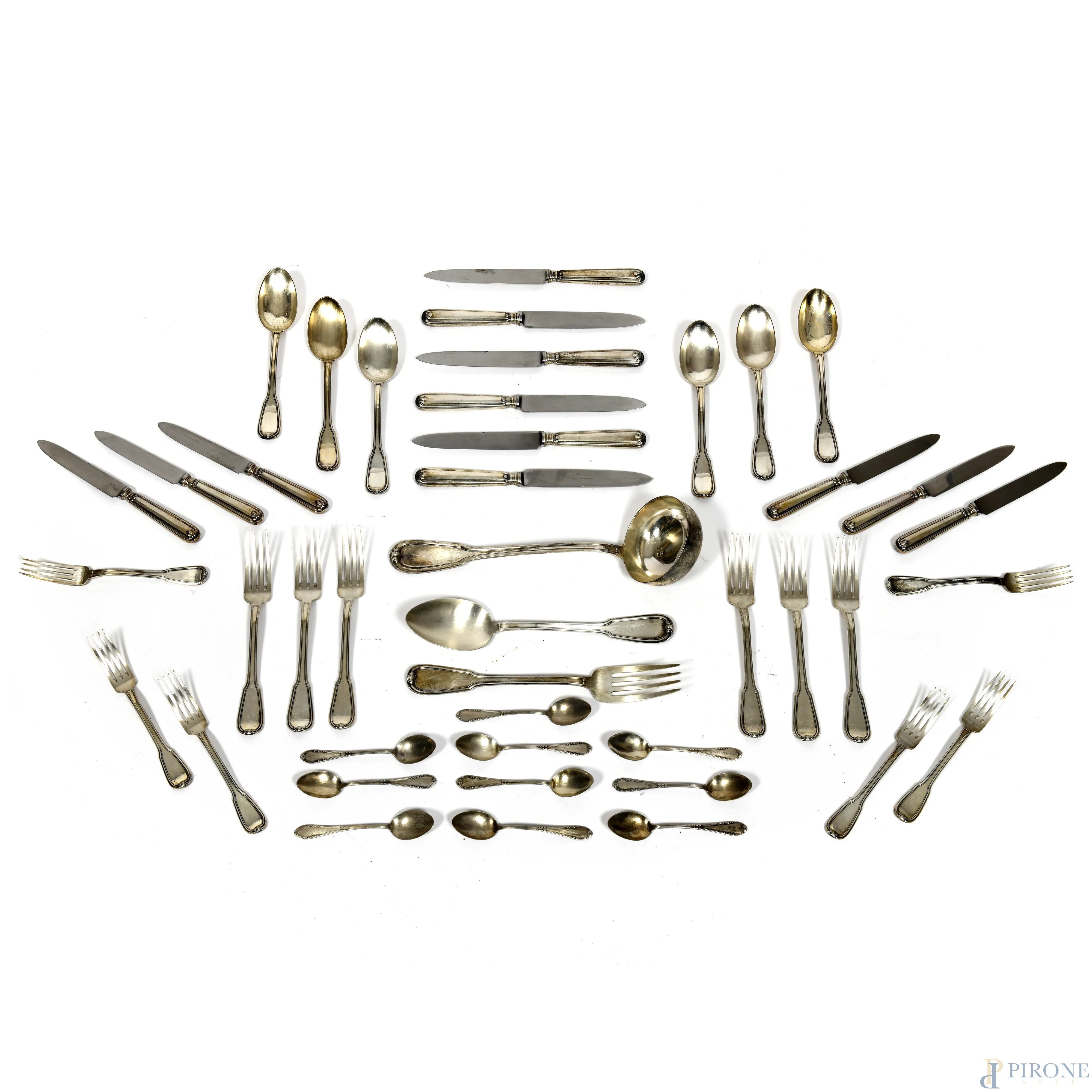 3 posate da portata, 6 forchette piccole, 6 forchette grandi, 6 cucchiai, 6 cucchiaini (non pertinenti), 6 coltelli grandi, 6 coltelli piccoli