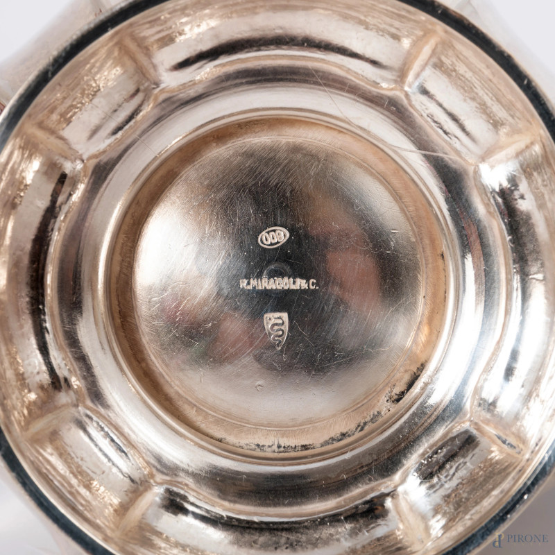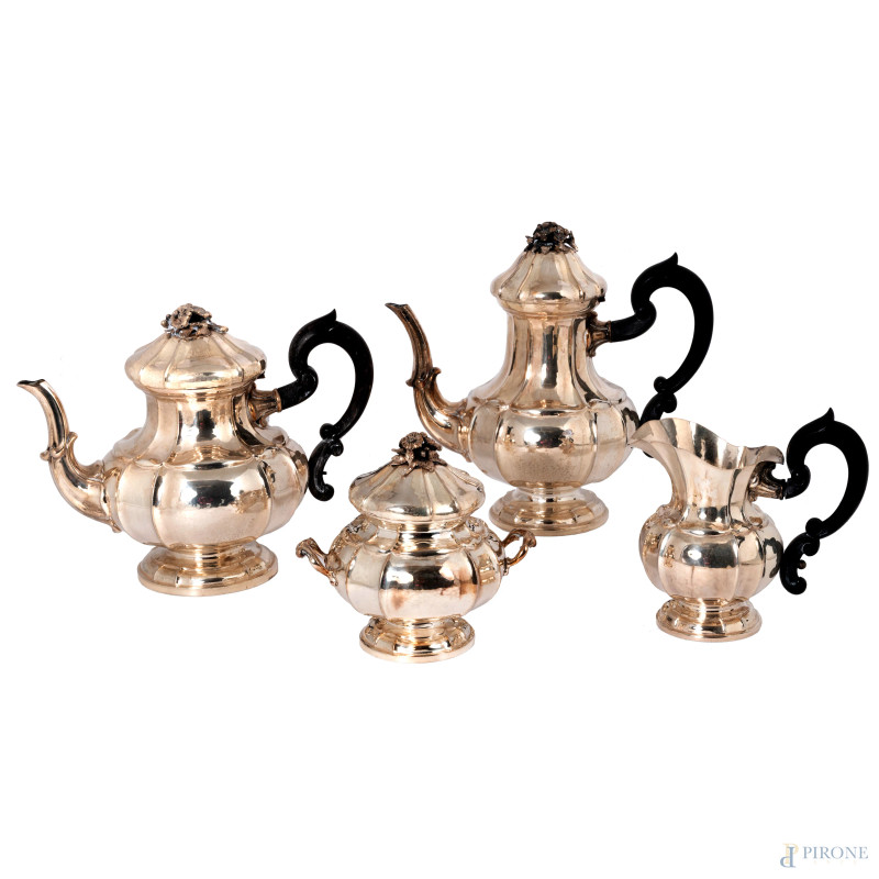Servizio in argento 800/000 con manici in legno composto da caffettiera, teiera, lattiera e zuccheriera, altezza massima cm 26, peso lordo complessivo gr 3140