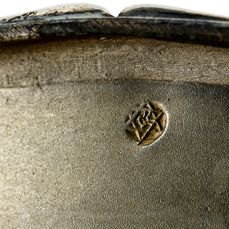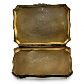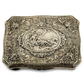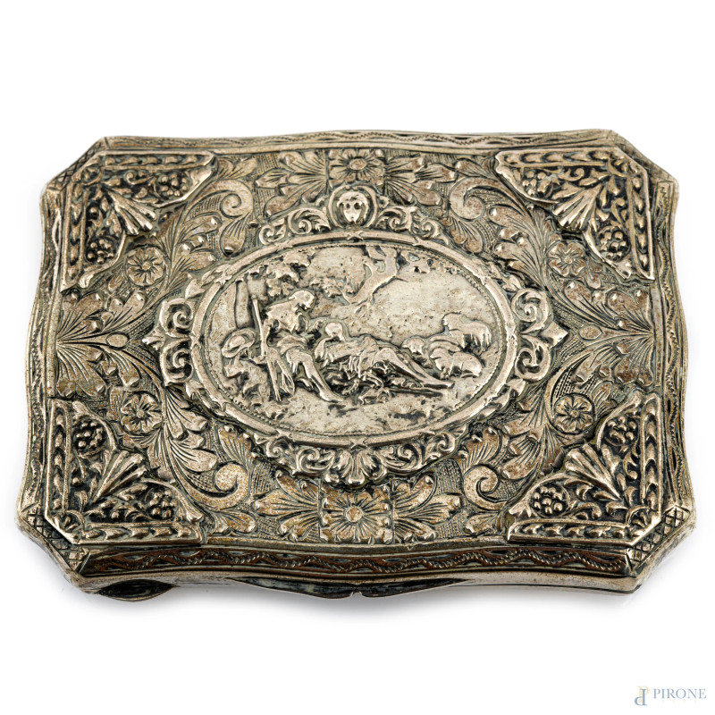 Tabacchiera in argento 800/000 lavorato a sbalzo con ricco cesello al coperchio, XX secolo, cm 7,5x6, peso gr 60
