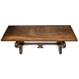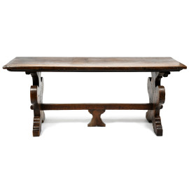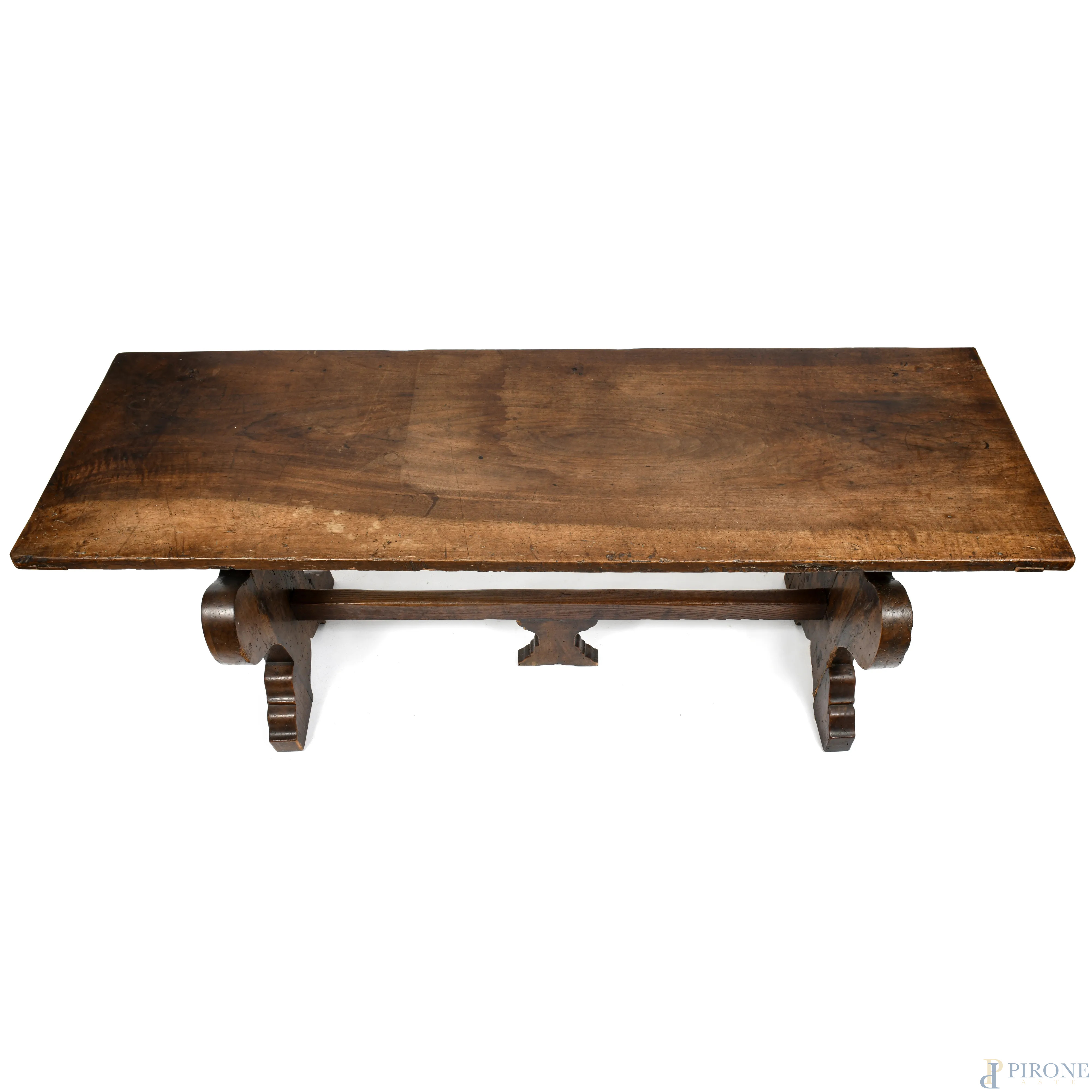 Tavolo fratino in noce, XVIII-XIX secolo, cm 80x192,5x61, (gambe e traversa removibili; segni di usura, scalfiture, difetti, fori di tarlo)