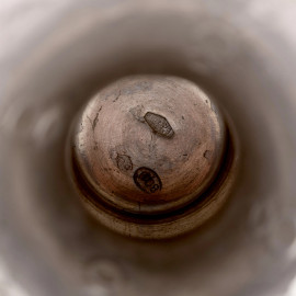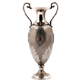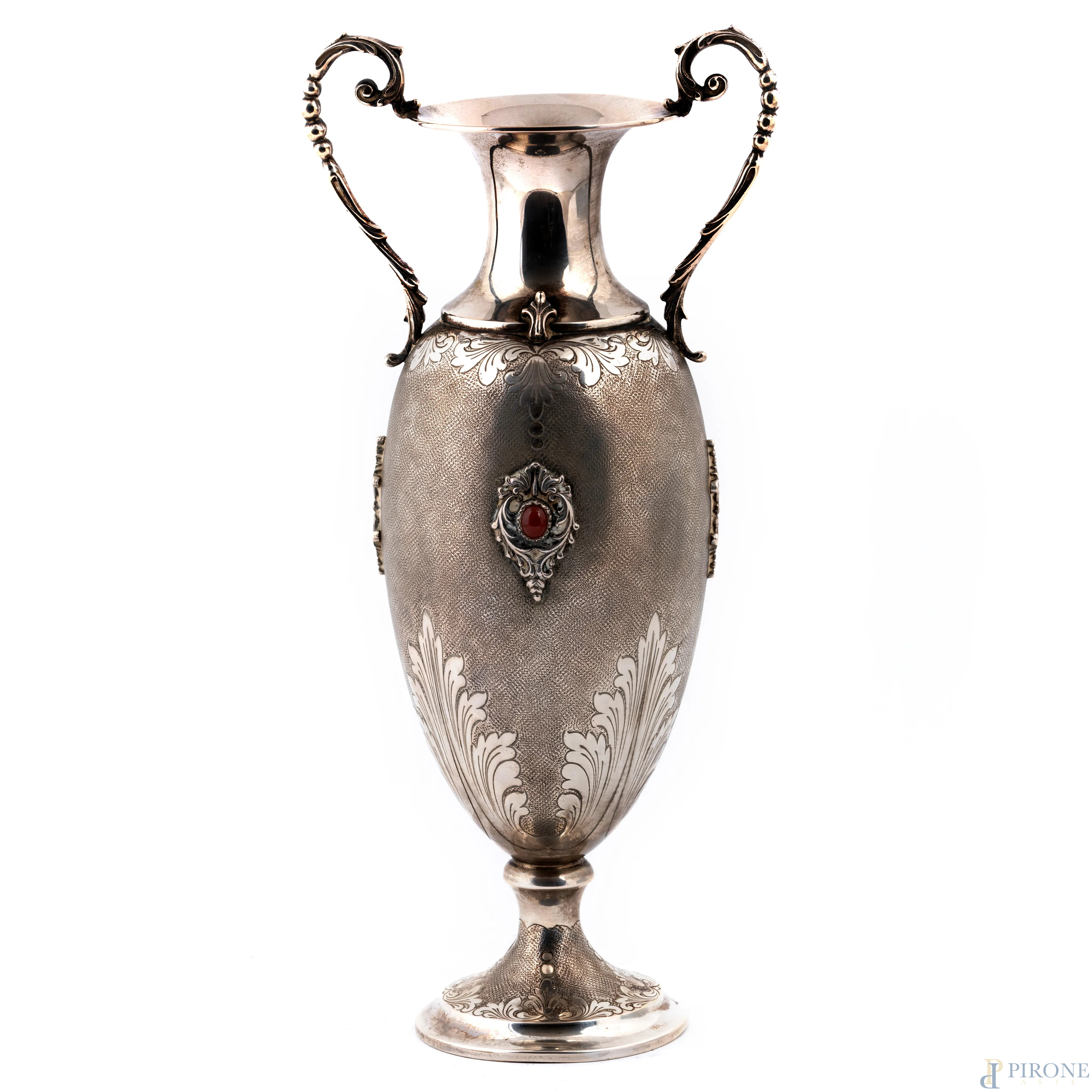 Vaso biansato in argento 800/000 finemente sbalzato e cesellato e pietra dura centrale, altezza cm 29, peso gr 420