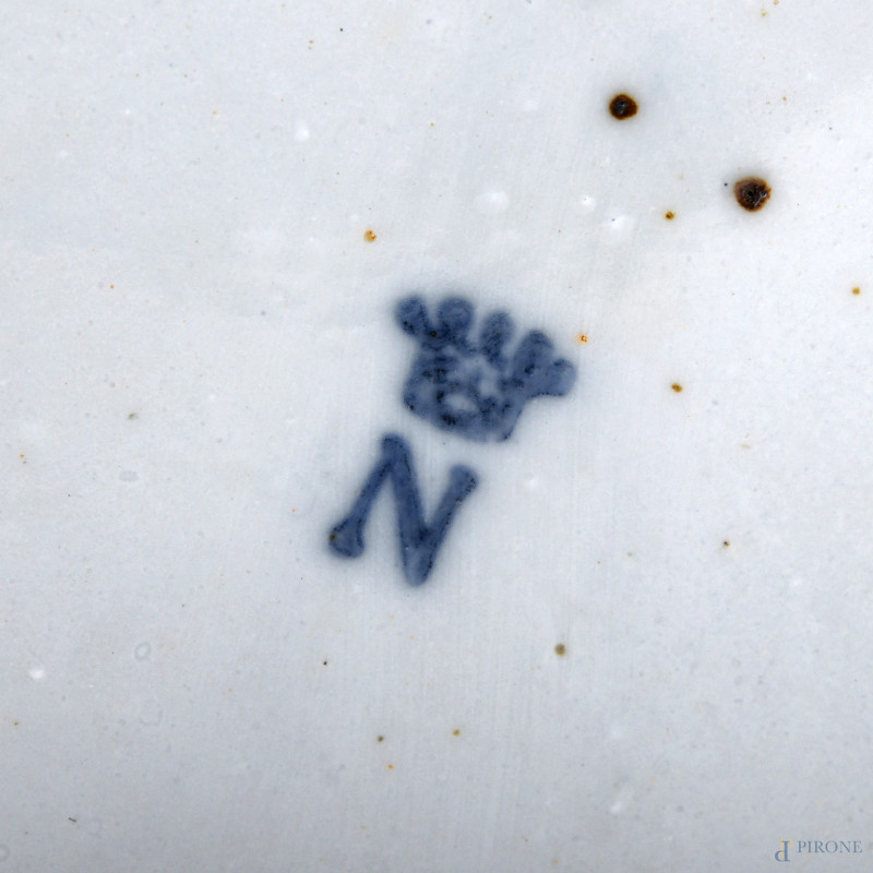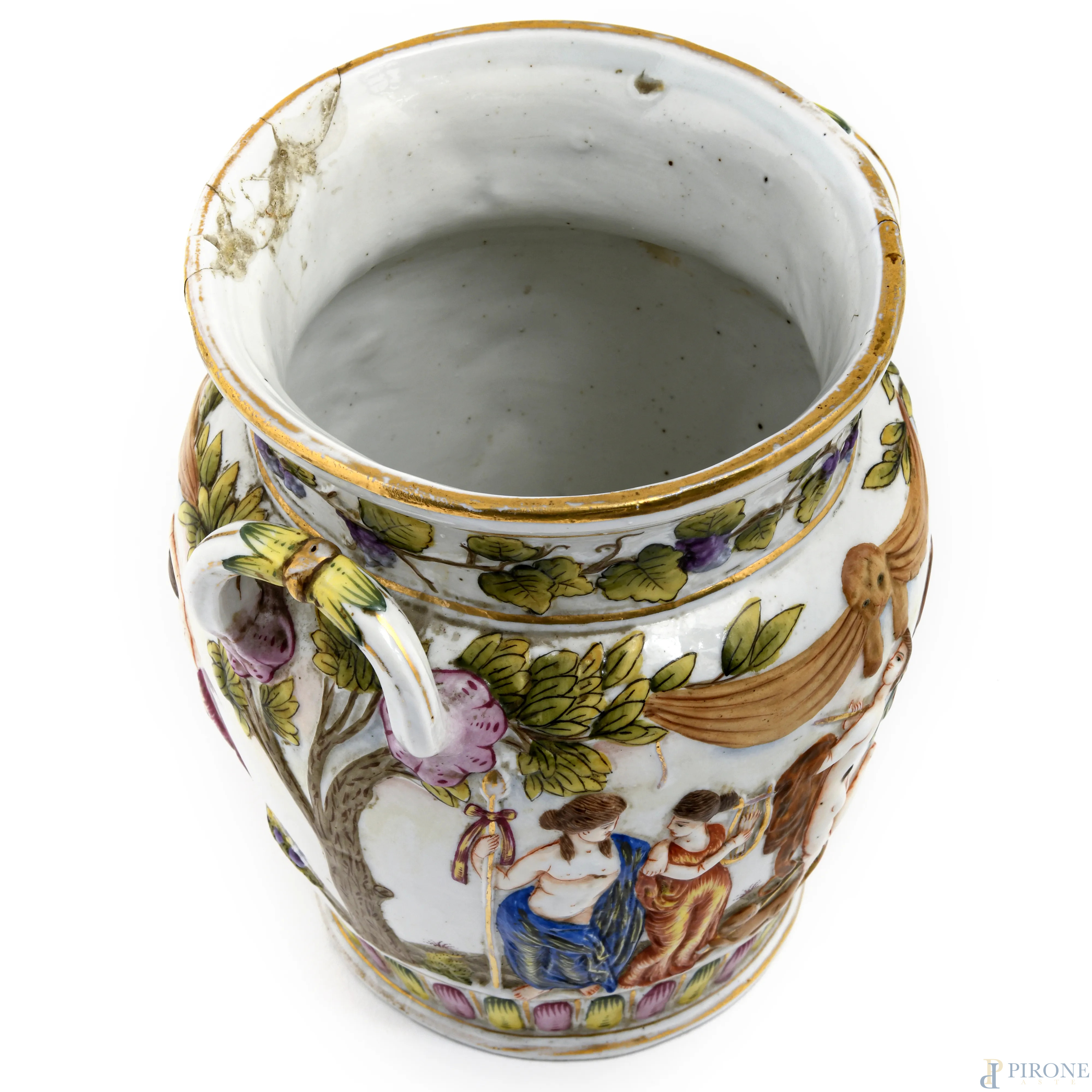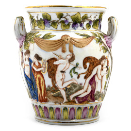Vaso in ceramica Capodimonte con raffigurazioni a rilievo di scene mitologiche, XIX -XX secolo, altezza cm 19, (difetti, rotture, restauri)