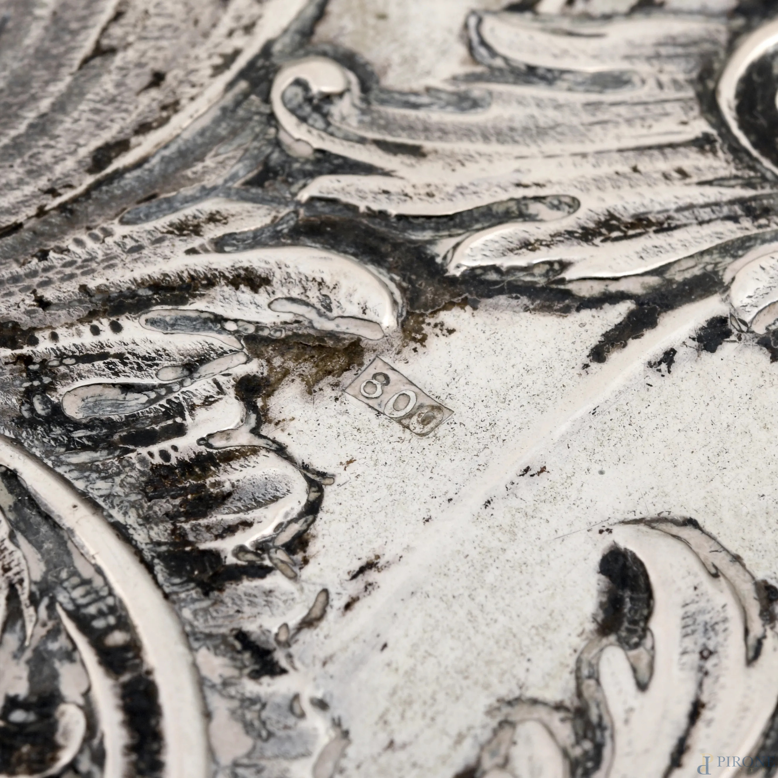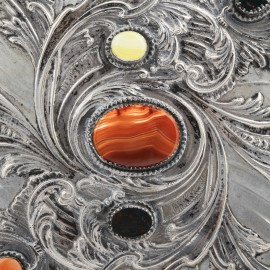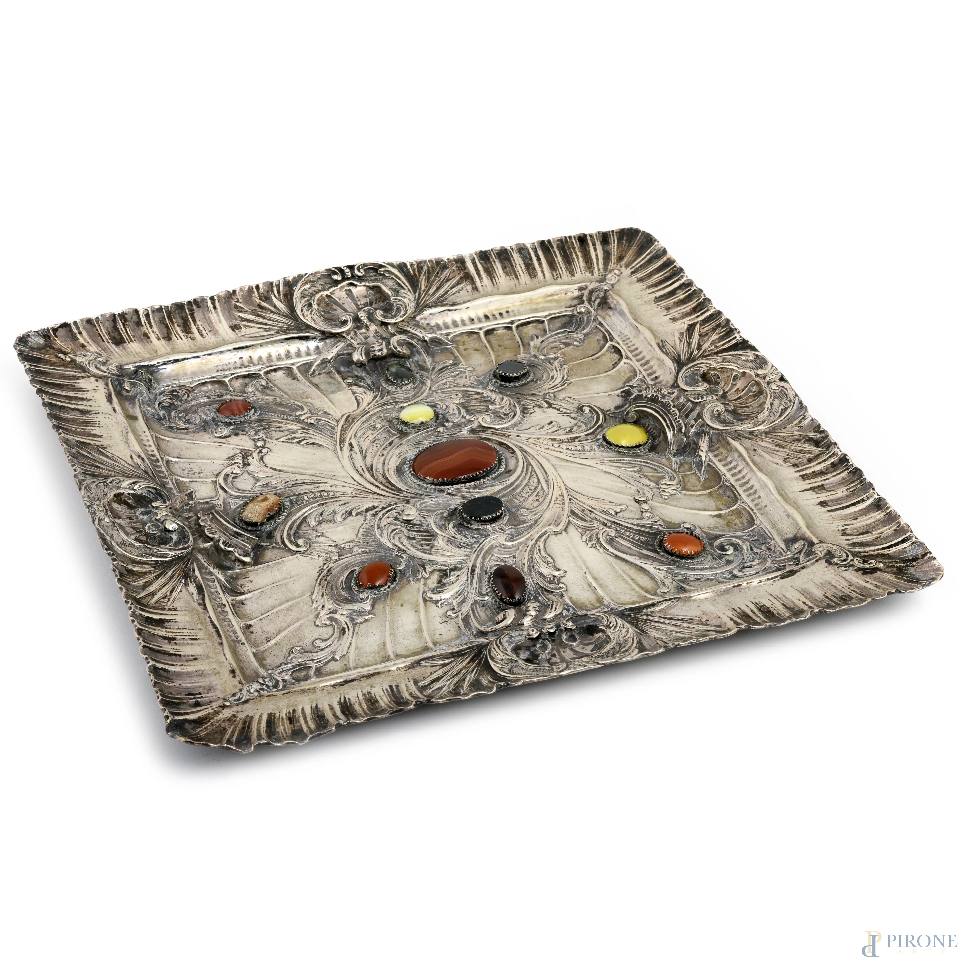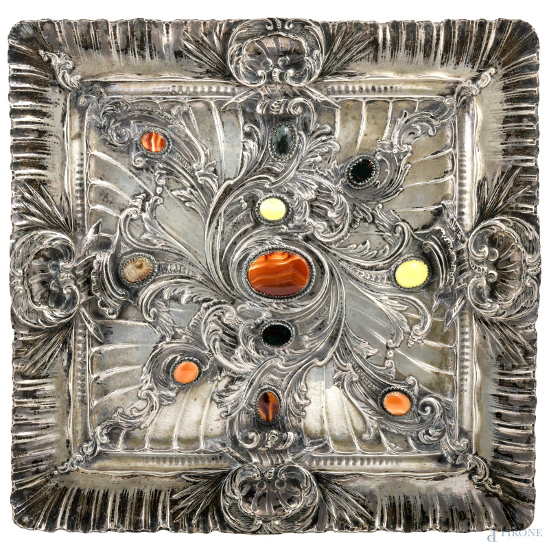 Vassoio centrotavola in argento 800/000 e pietre dure, cm 34x35, peso lordo gr 960, (segni di usura)