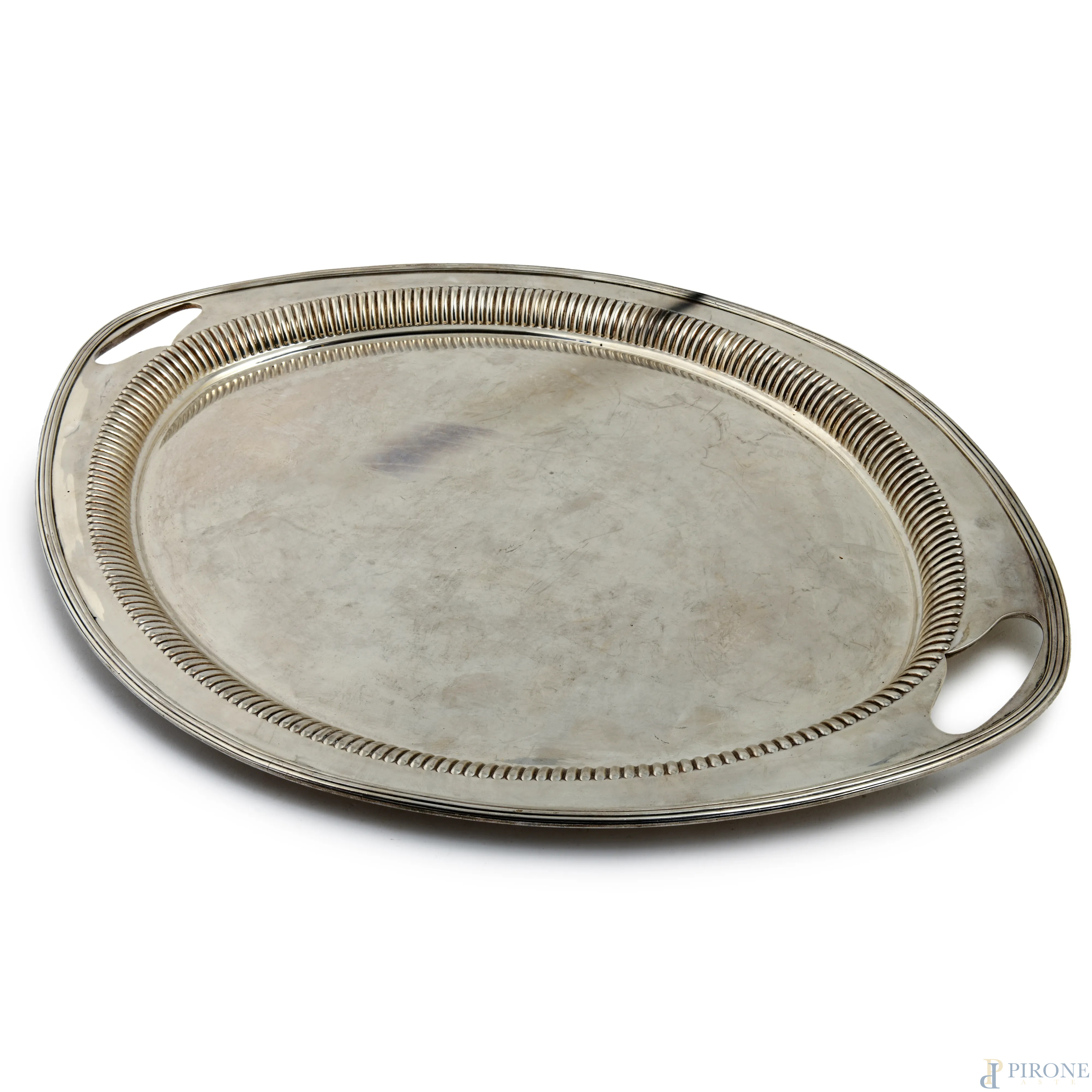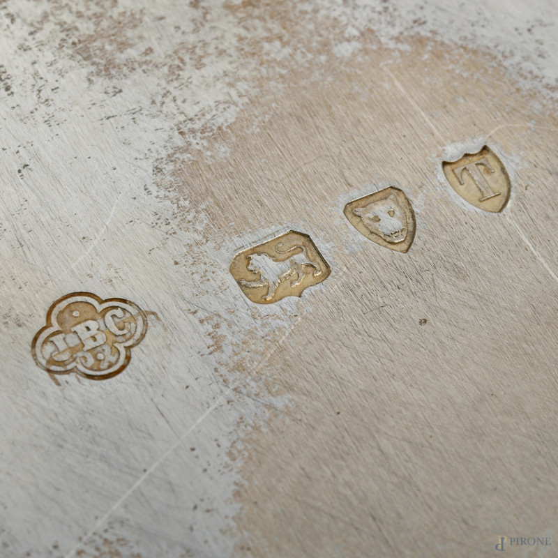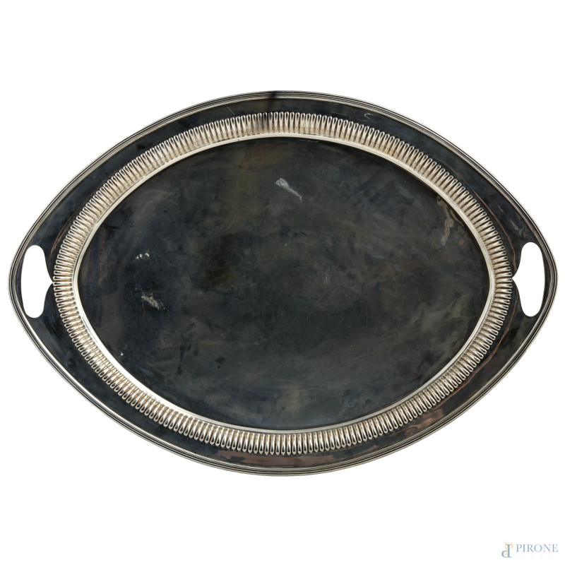Vassoio in argento inglese a doppia presa, peso gr 3100, cm 64x46