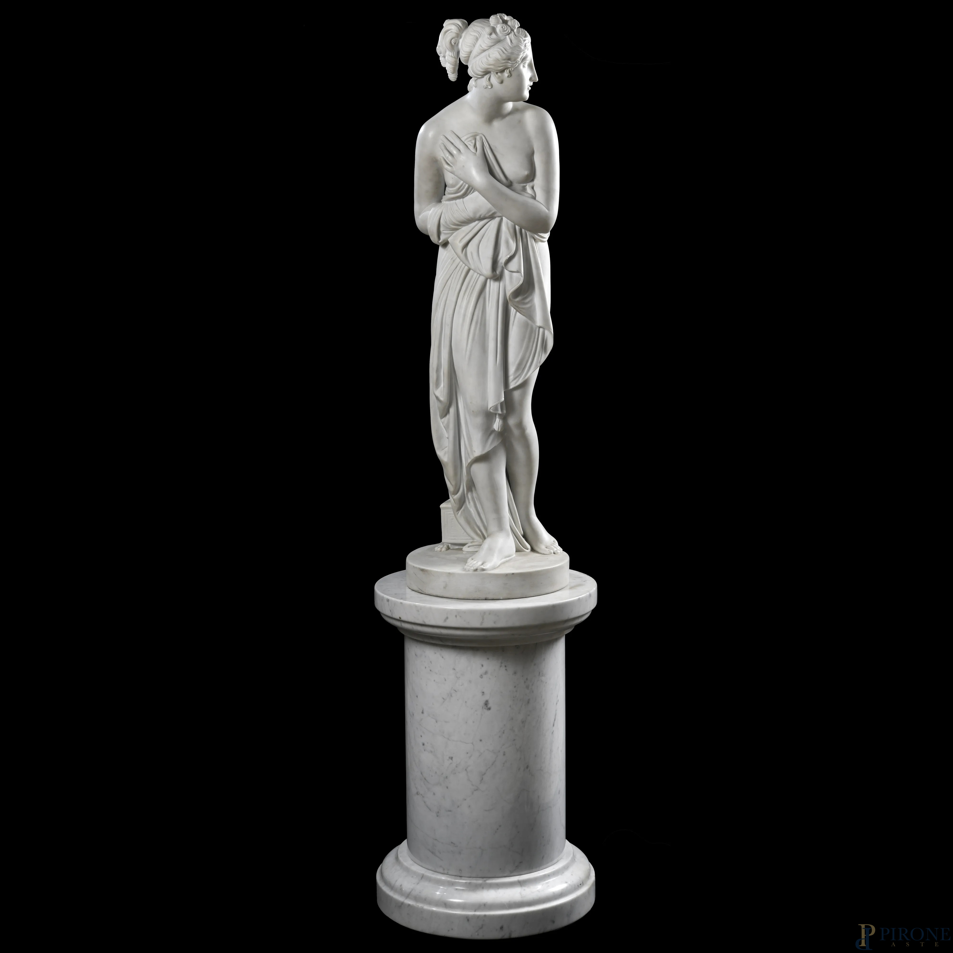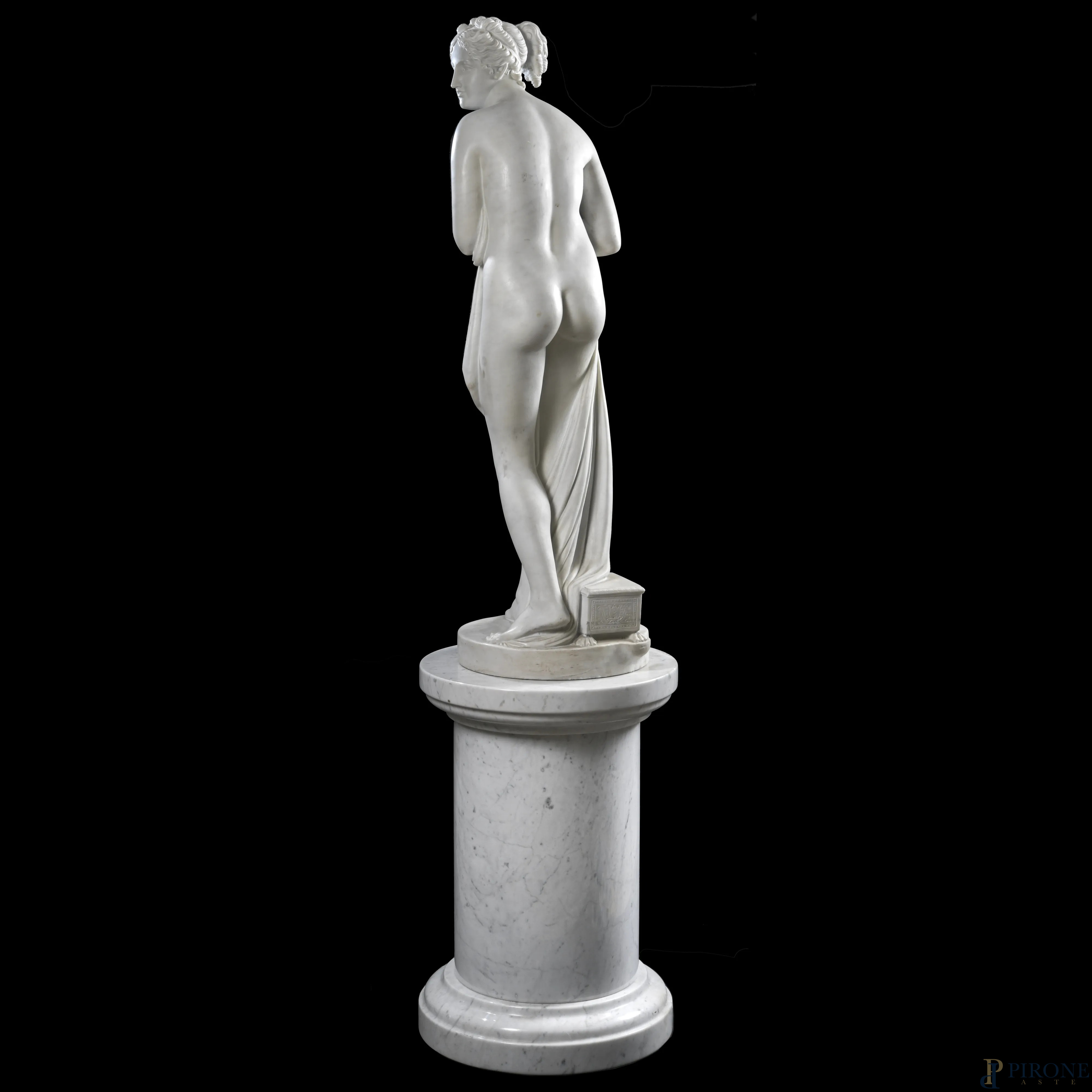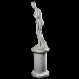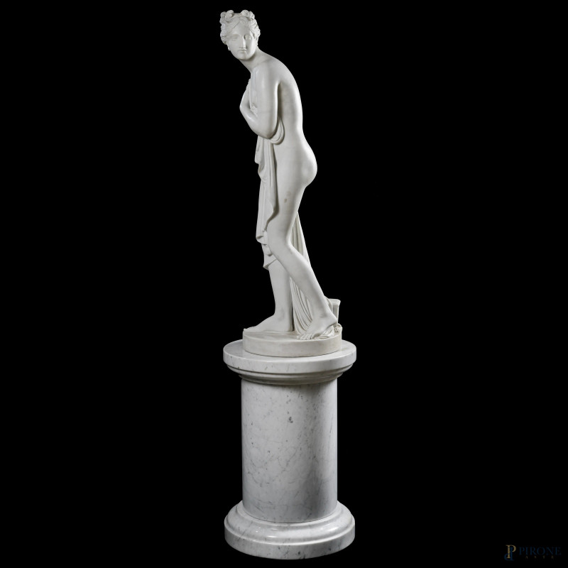 Venere al bagno, XIX secolo, scultura in marmo, altezza cm 103 su colonna in marmo, altezza cm 60,5