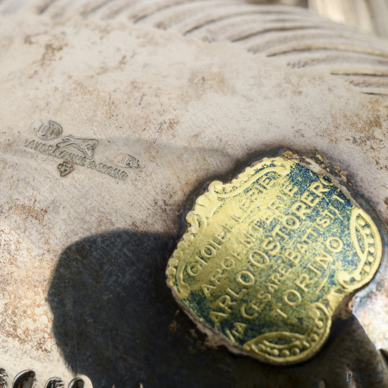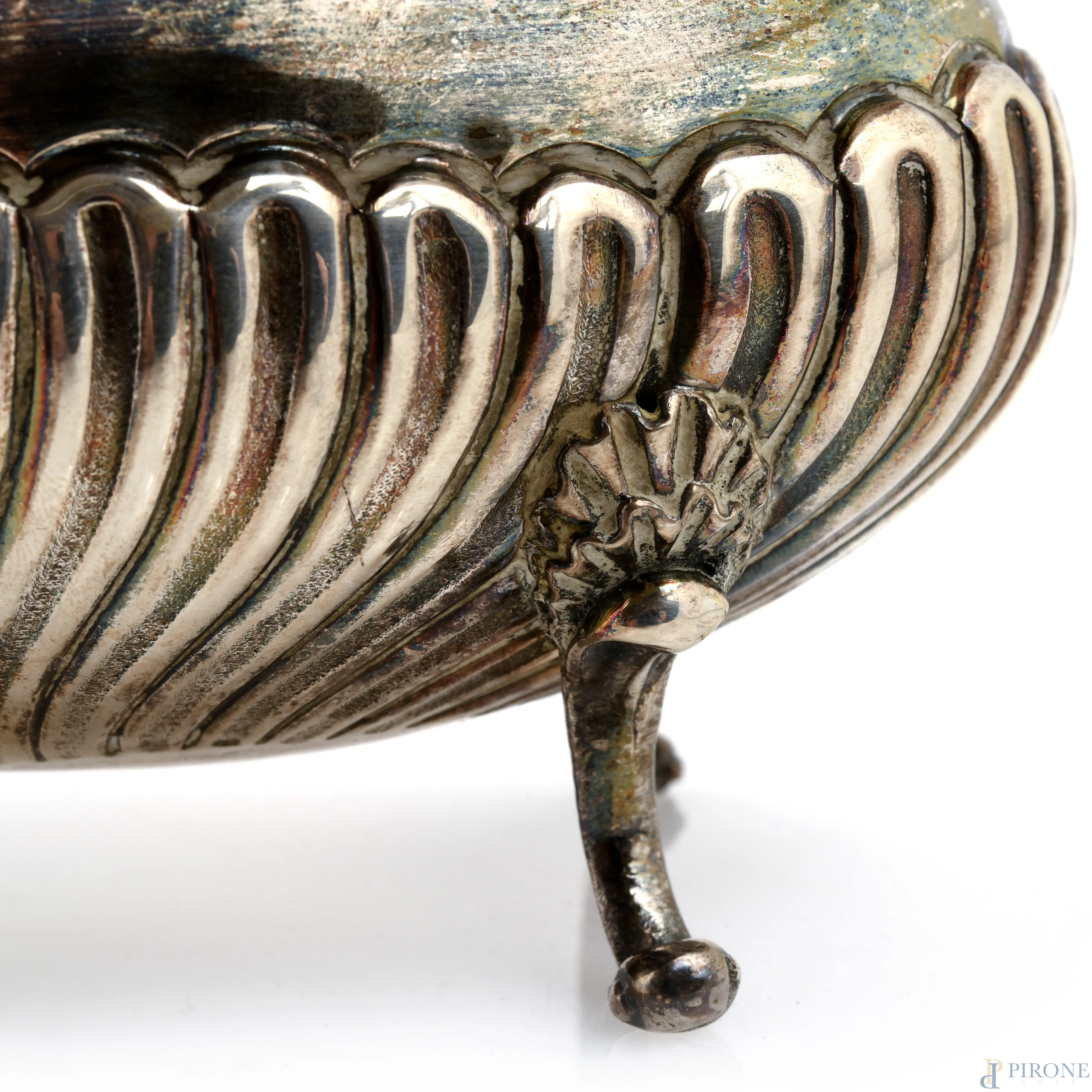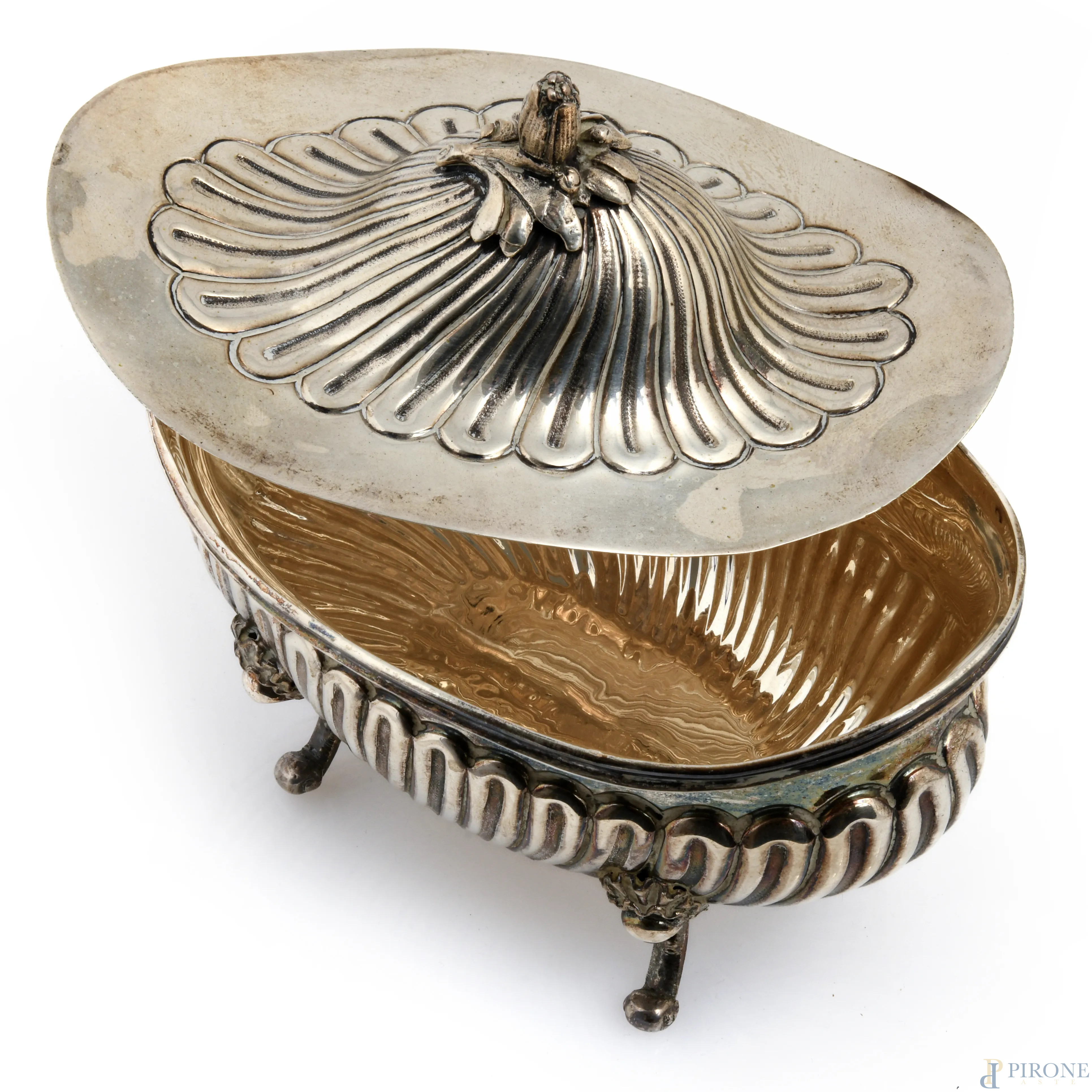 Zuccheriera in argento 800/000 cesellato poggiante su quattro piedini con presa a foggia di bocciolo, cm 14x15,5x11,5 , peso gr 460