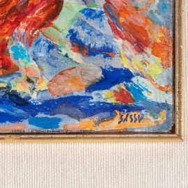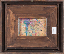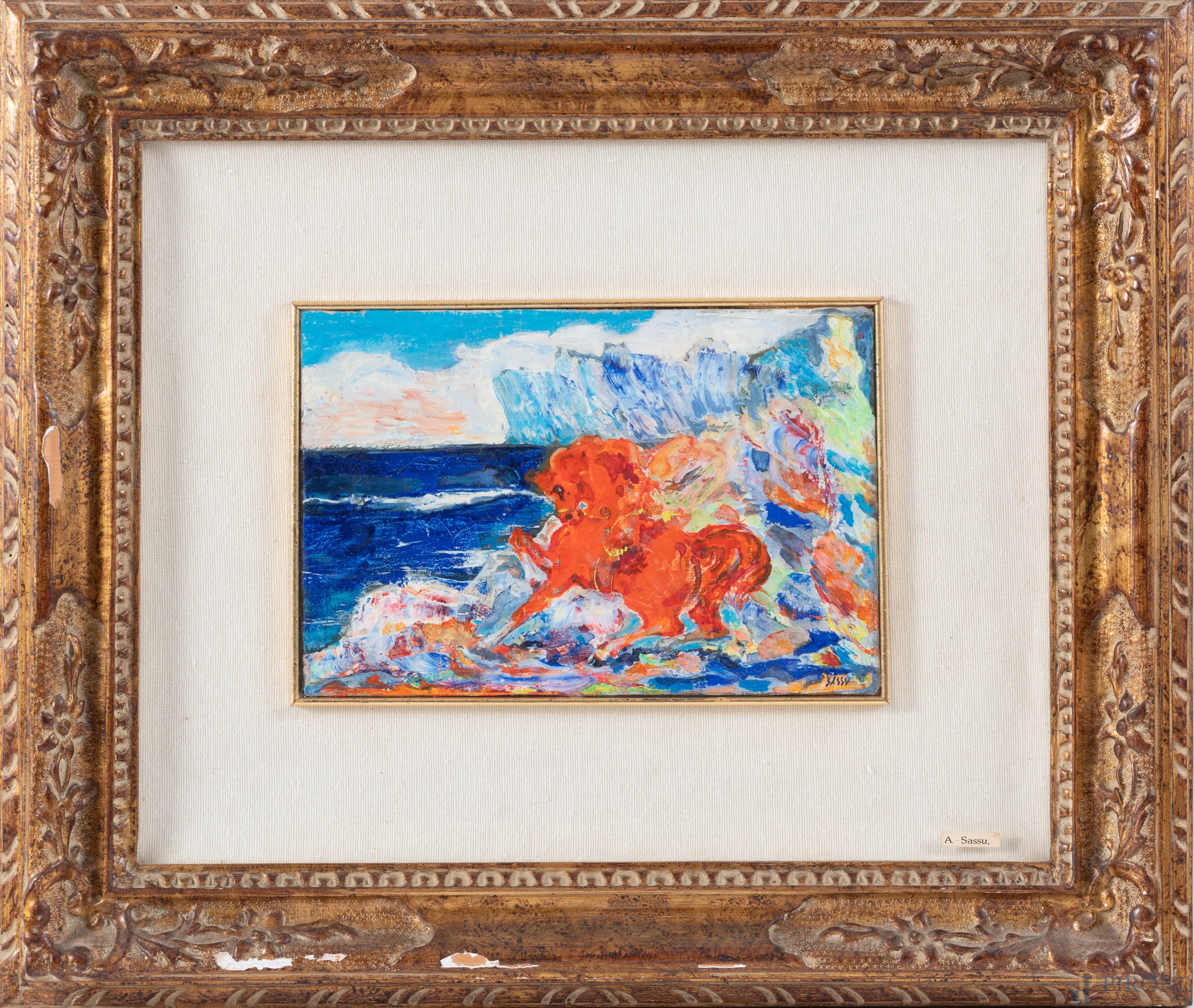 Aligi Sassu (1912-2000), Il rosso grande cavallo, 1985, olio su cartone, cm 16,5x25, firmato in basso a sinistra, titolato, firmato e datato al retro, entro cornice