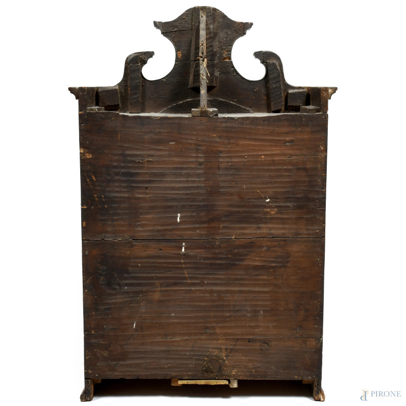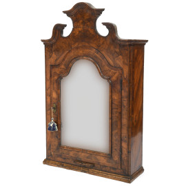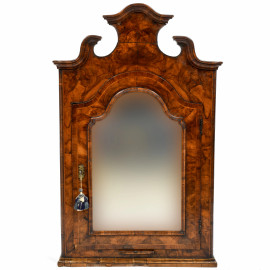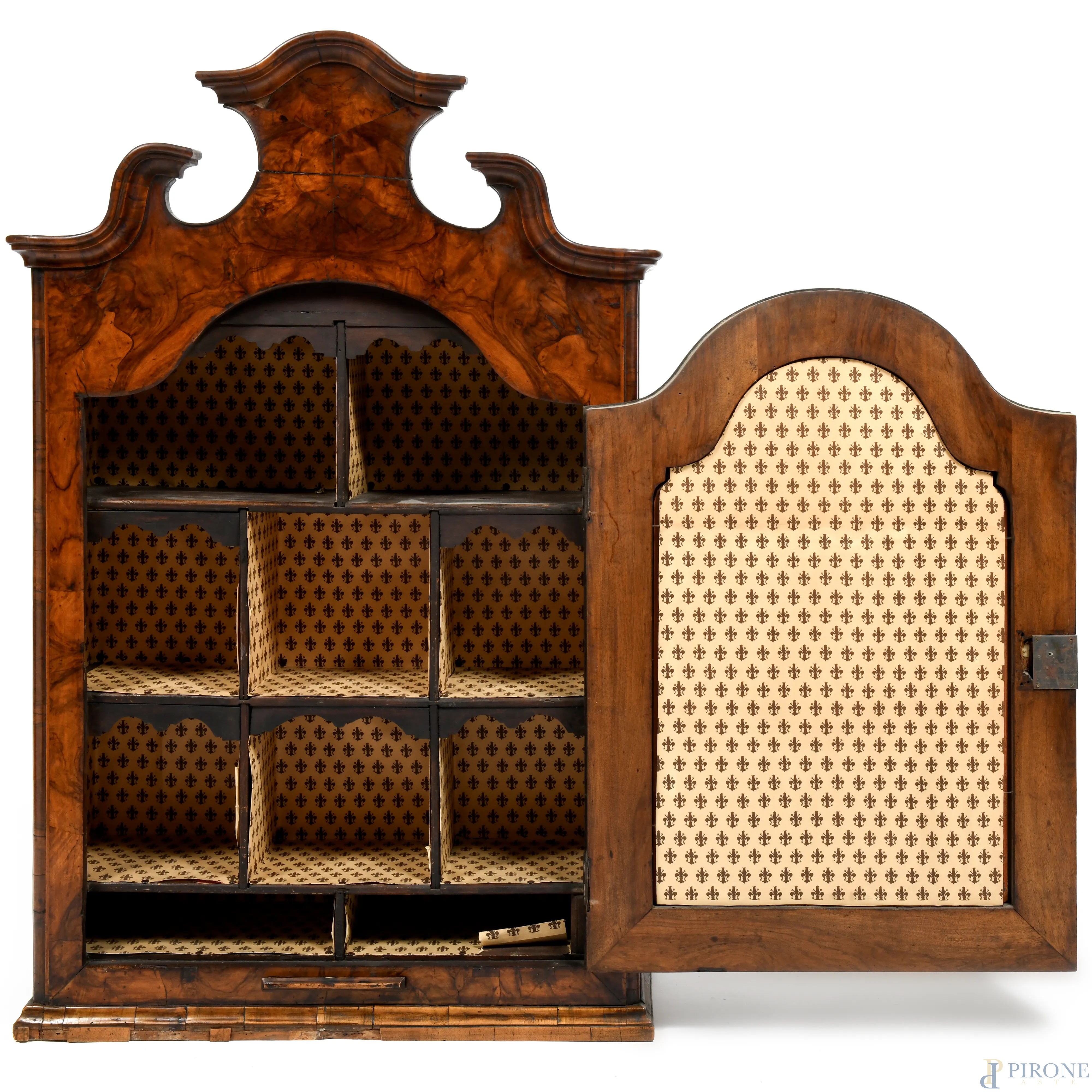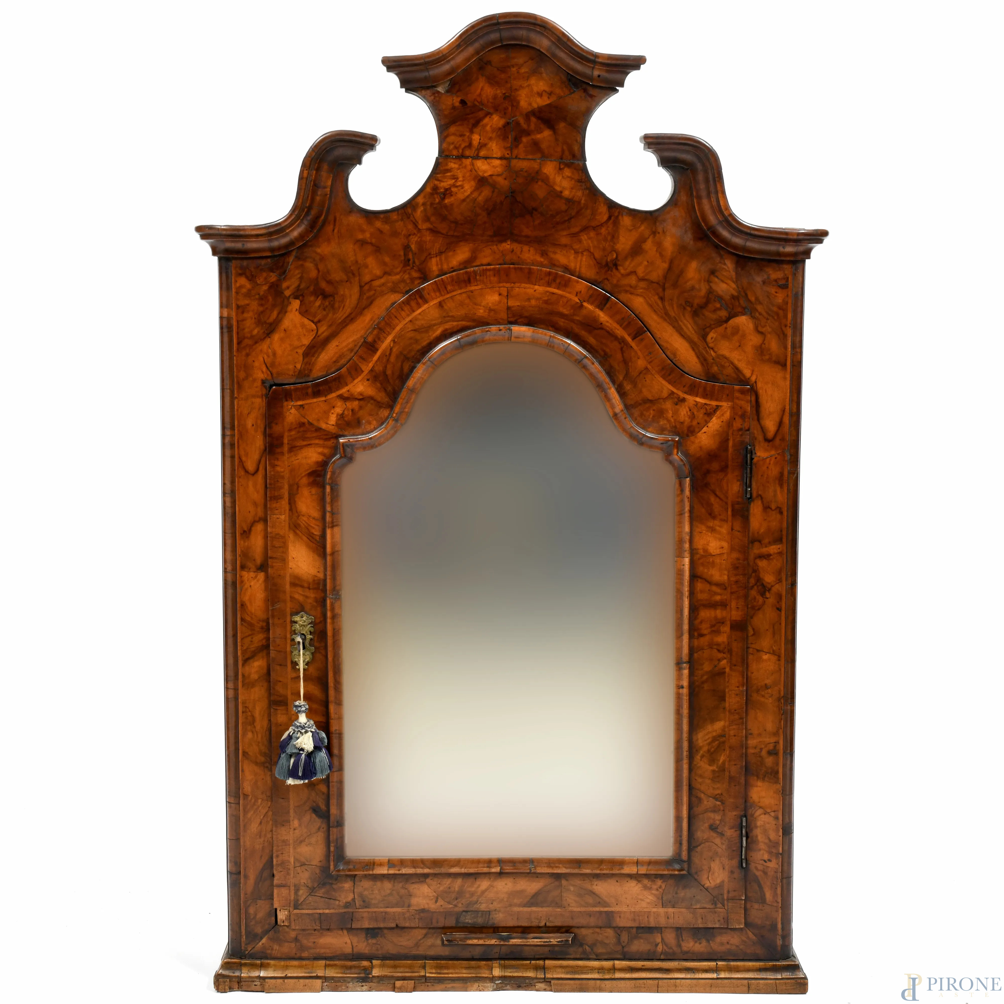 Alzata impiallacciata in radica dal profilo apicale sagomato, a singola anta specchiata e interno suddiviso in vani, XX secolo, cm 127x77x26, (segni di usura, scalfiture difetti)