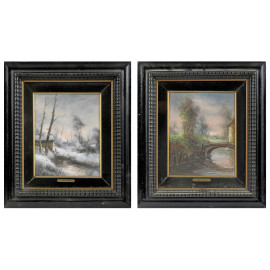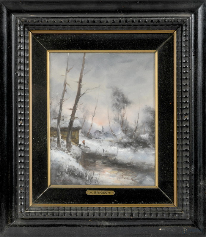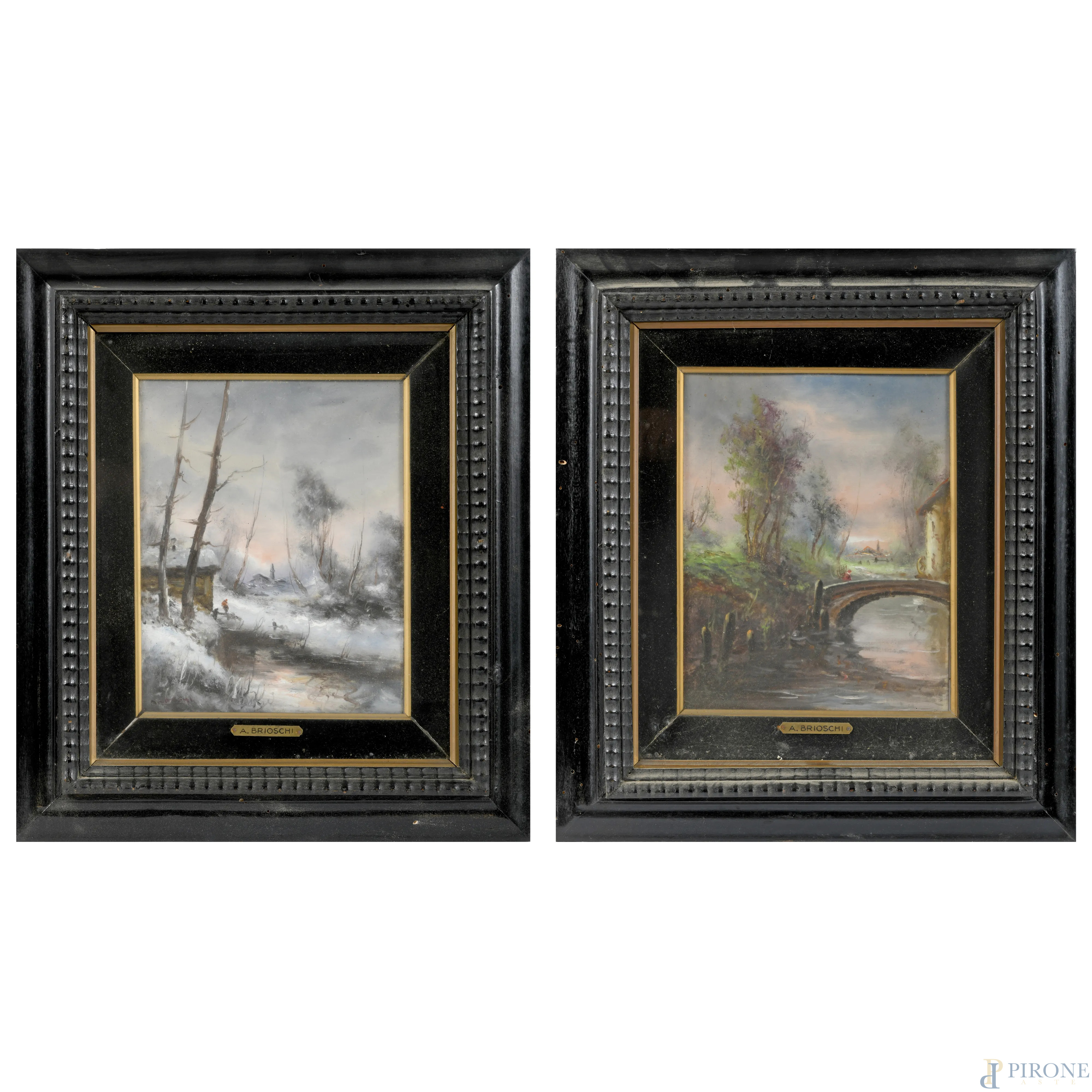 Athos Renzo Brioschi (1910-2000), coppia di paesaggi, olio su tela applicata su cartone, 27x21, entro cornice, (supporti imbarcati)