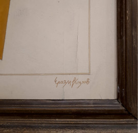 Avanguardia russa del Novecento, composizione geometrica suprematista, tecnica mista su tavola, cm 43x34, firmato Erazm Kozlov in caratteri cirillici