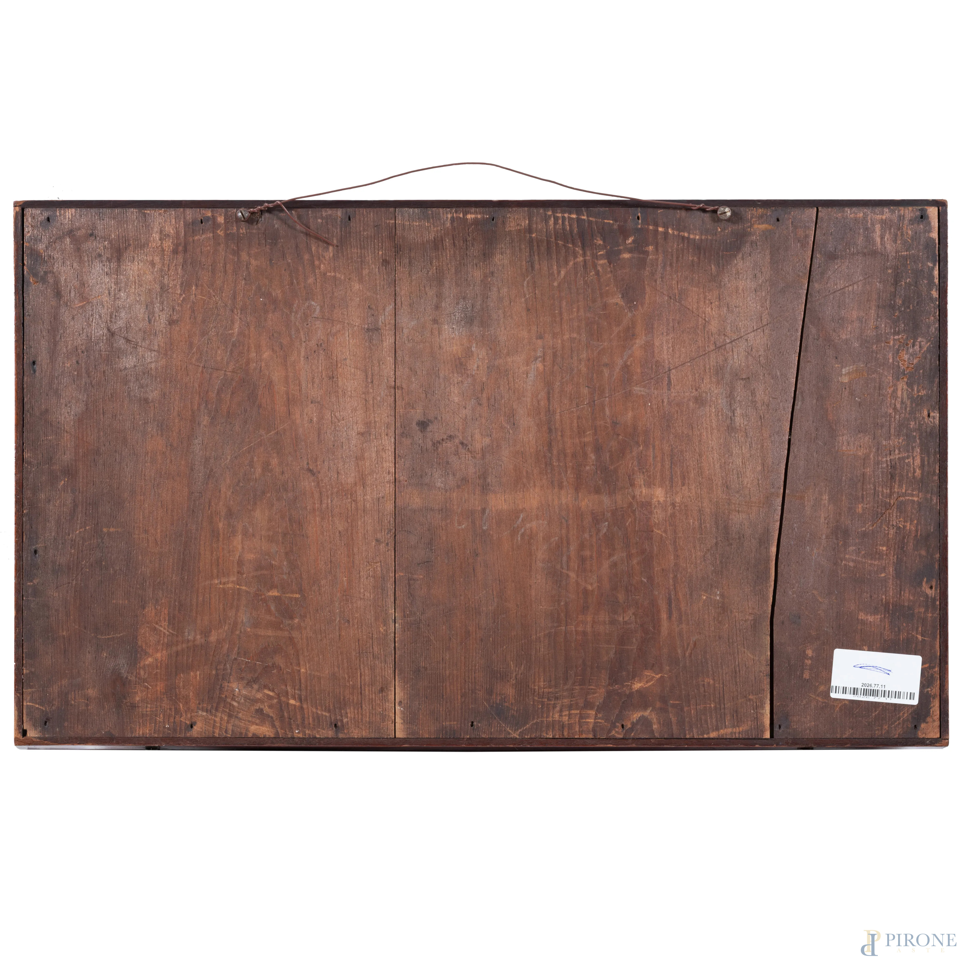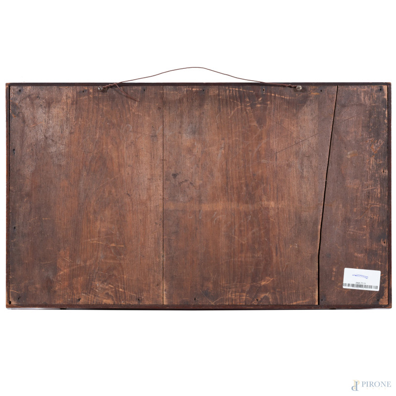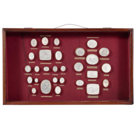 Bacheca contenente calchi di monete in stucco, XX secolo, misure complessive cm 36x61