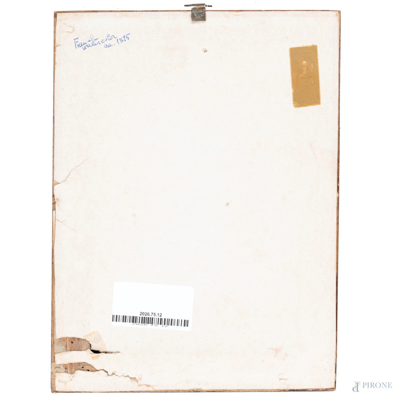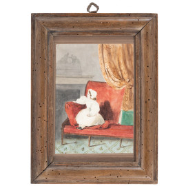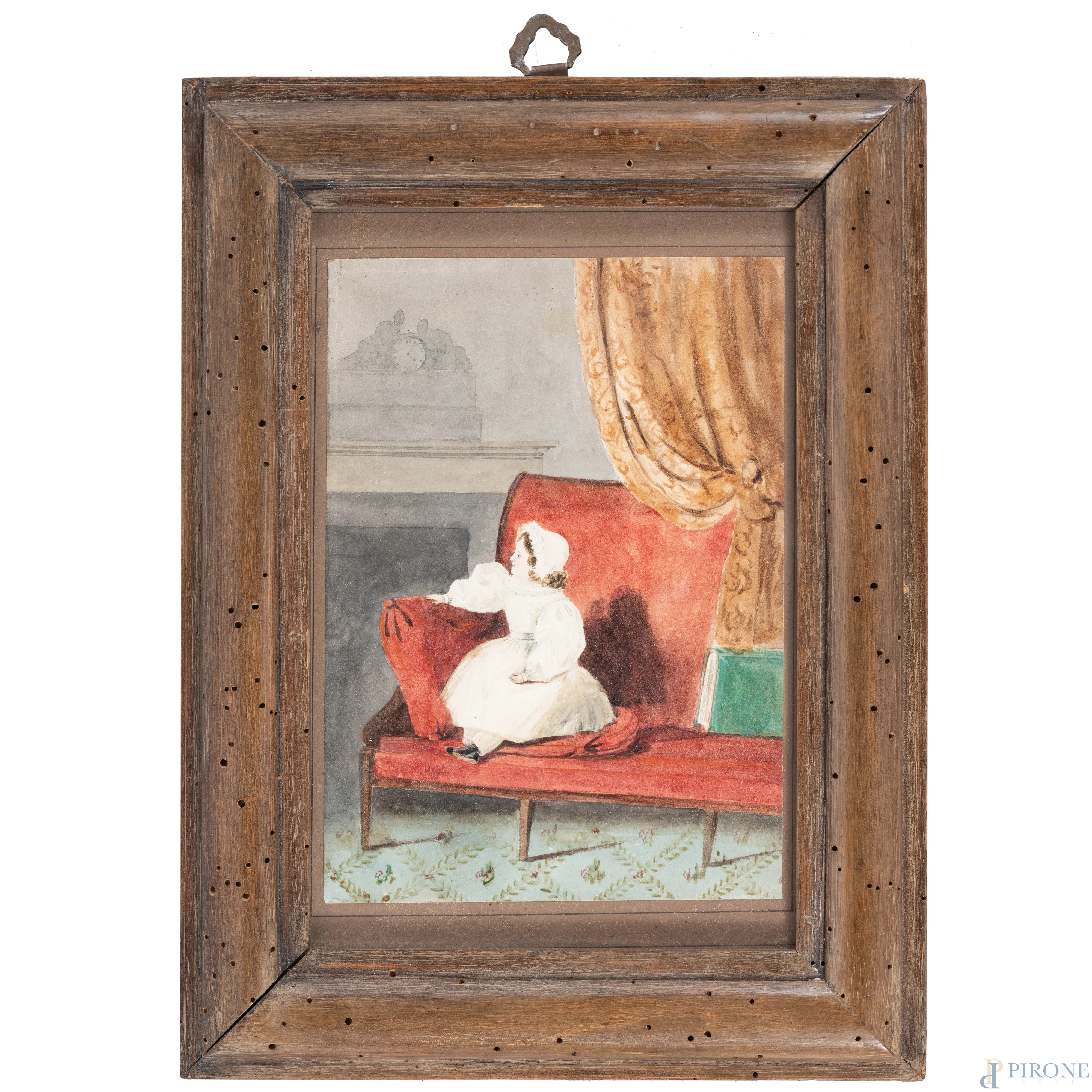 Bambina sul divano, XIX secolo, tecnica mista su carta applicata su carta, cm 17x12,5, entro cornice, (ondulazioni del supporto)