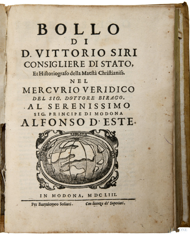 Bollo di D. Vittorio Siri, Modena, 1653, (segni di usura, restauri, tracce di umidità, difetti)