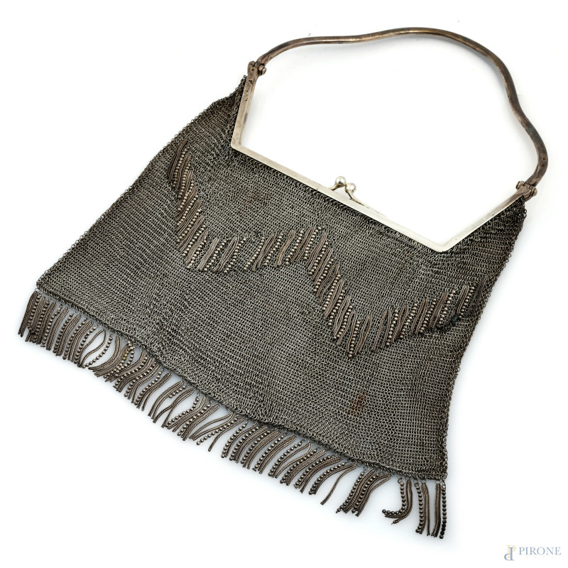 Borsetta in argento, XX secolo, cm 30x22, peso gr 310, (segni di usura)