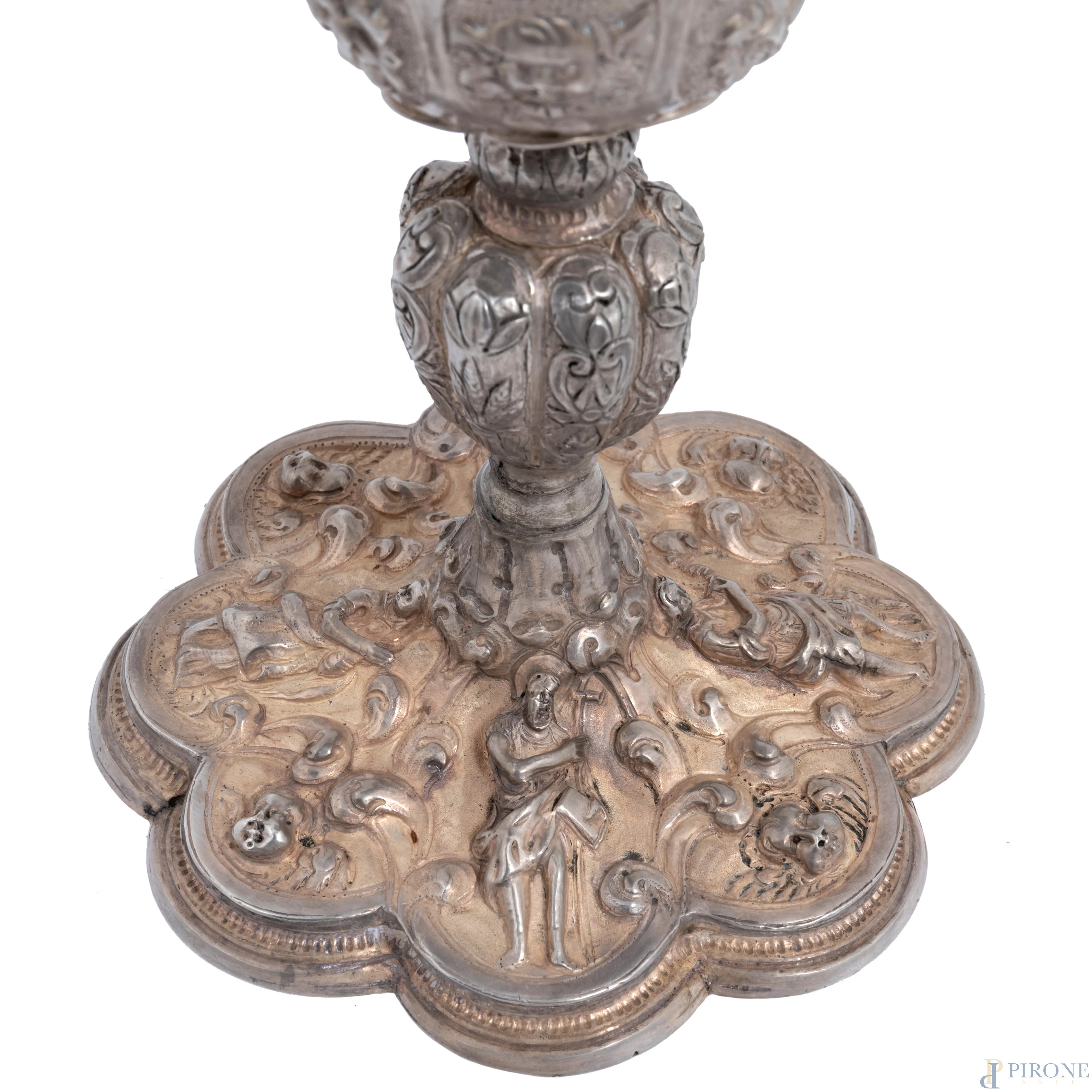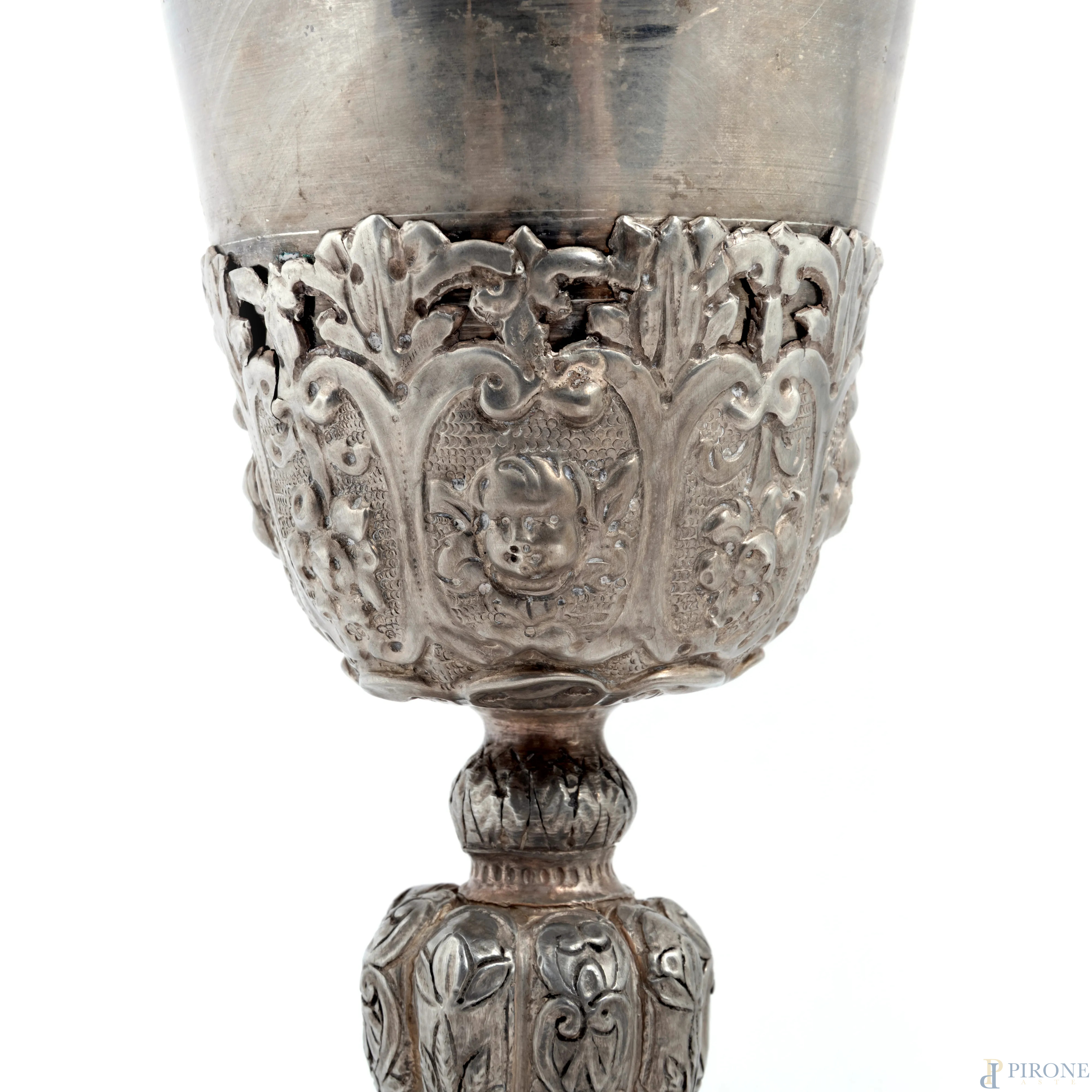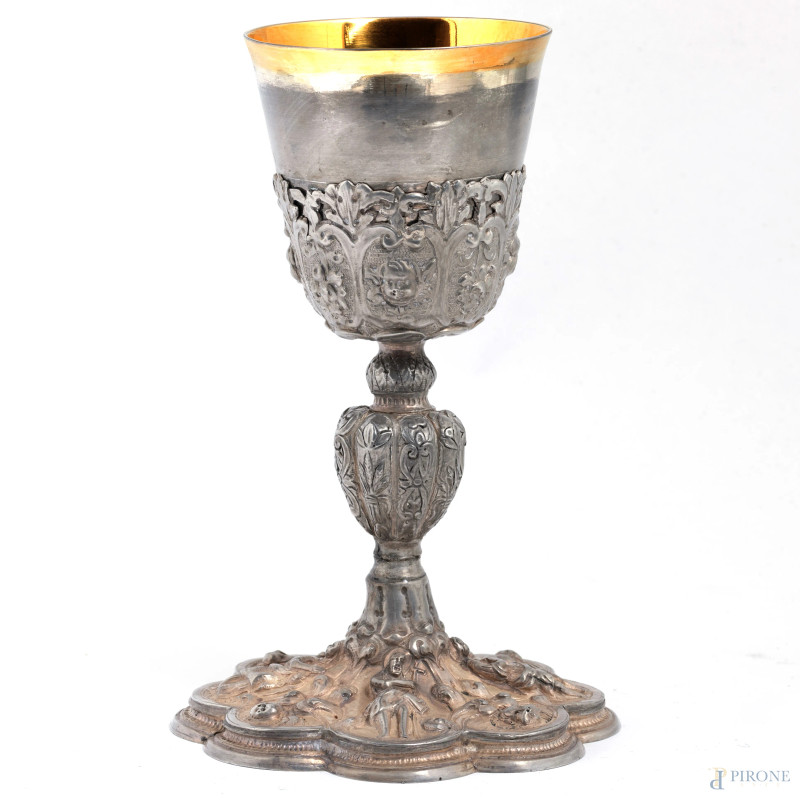 Calice in argento finemente cesellato con interno vermeil, altezza cm 22, peso lordo complessivo gr 567, (segni di usura)