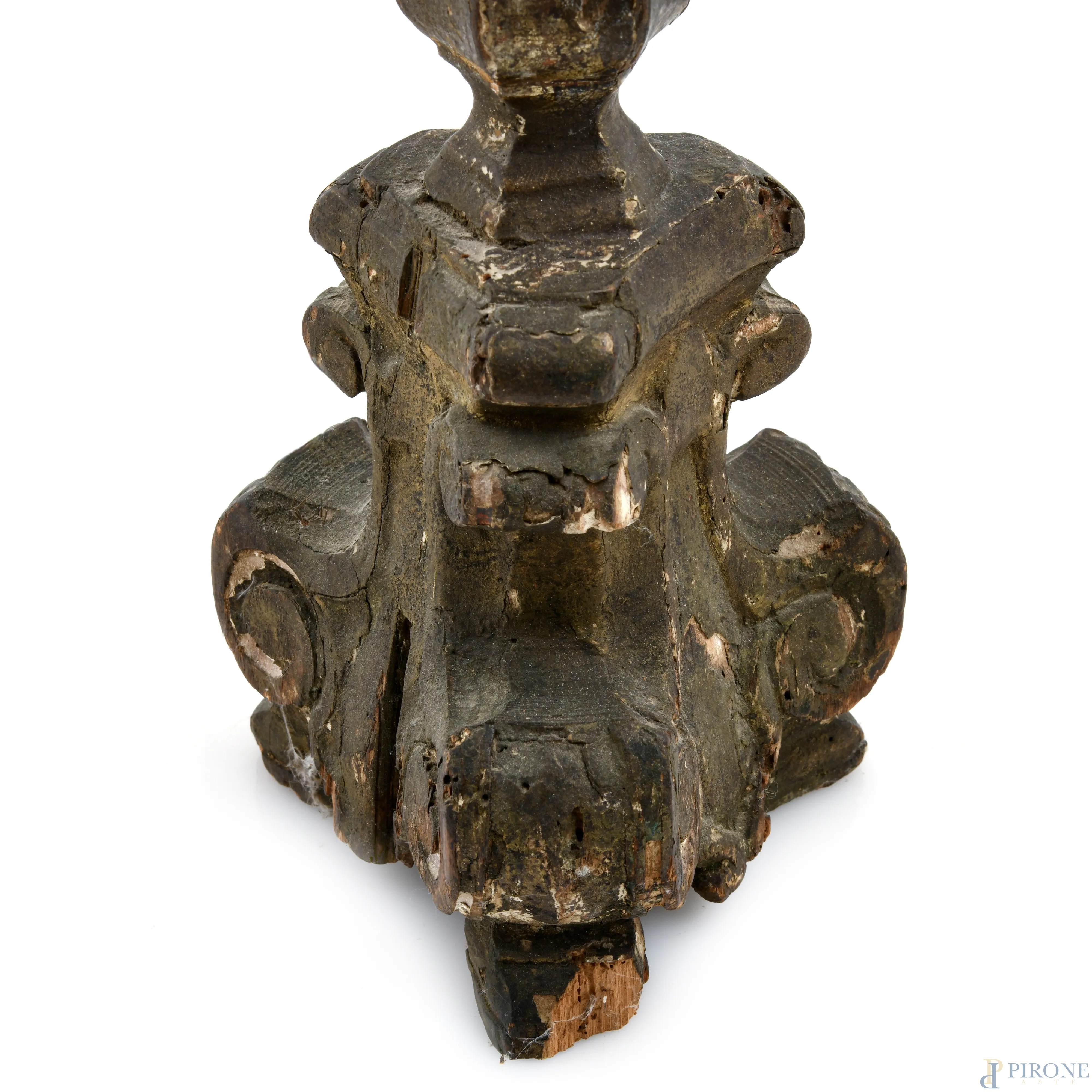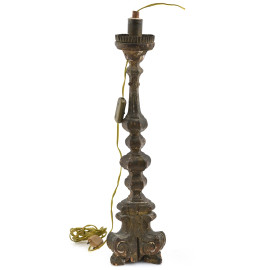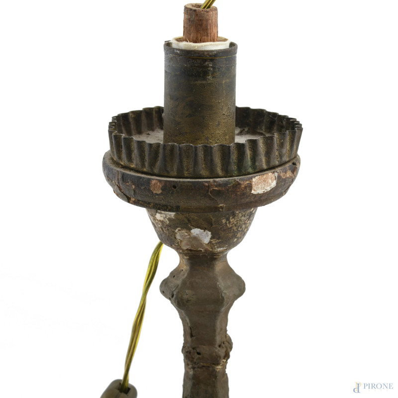 Candeliere in legno intagliato e dorato montato a lampada, XIX-XX secolo, altezza cm 52, (segni di usura, scalfiture, fessurazioni, cadute di doratura, da revisionare)