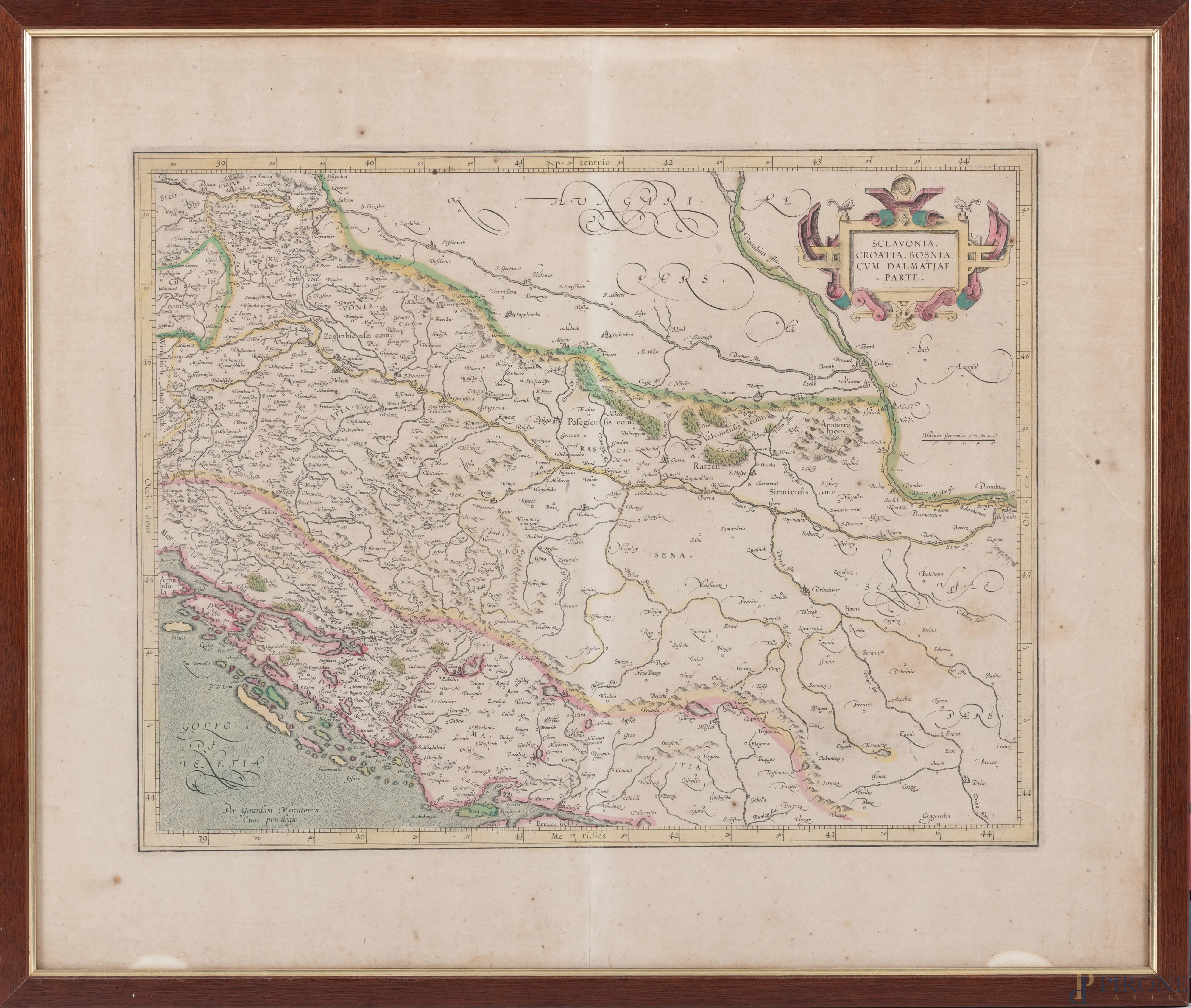 Carta geografica della Slavonia, Croazia, Bosnia e Dalmazia, XIX-XX secolo, cm 47,5x58, entro cornice, (tracce di umidità, foxing, bruniture, segni di usura, gore, difetti)