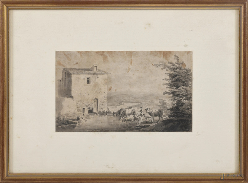 Casolare con armenti, XX secolo, stampa ritoccata, cm 11,5x19, entro cornice, (foxing, bruniture, gore, tracce di umidità, difetti)