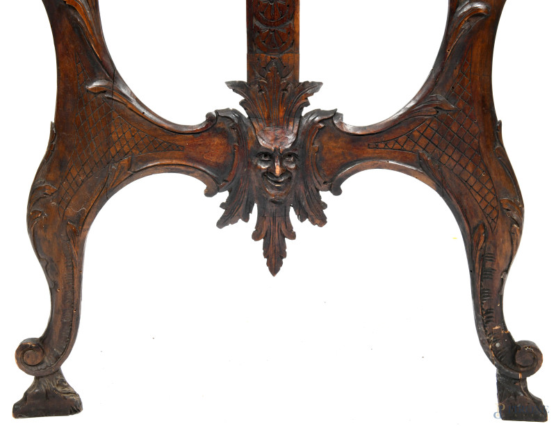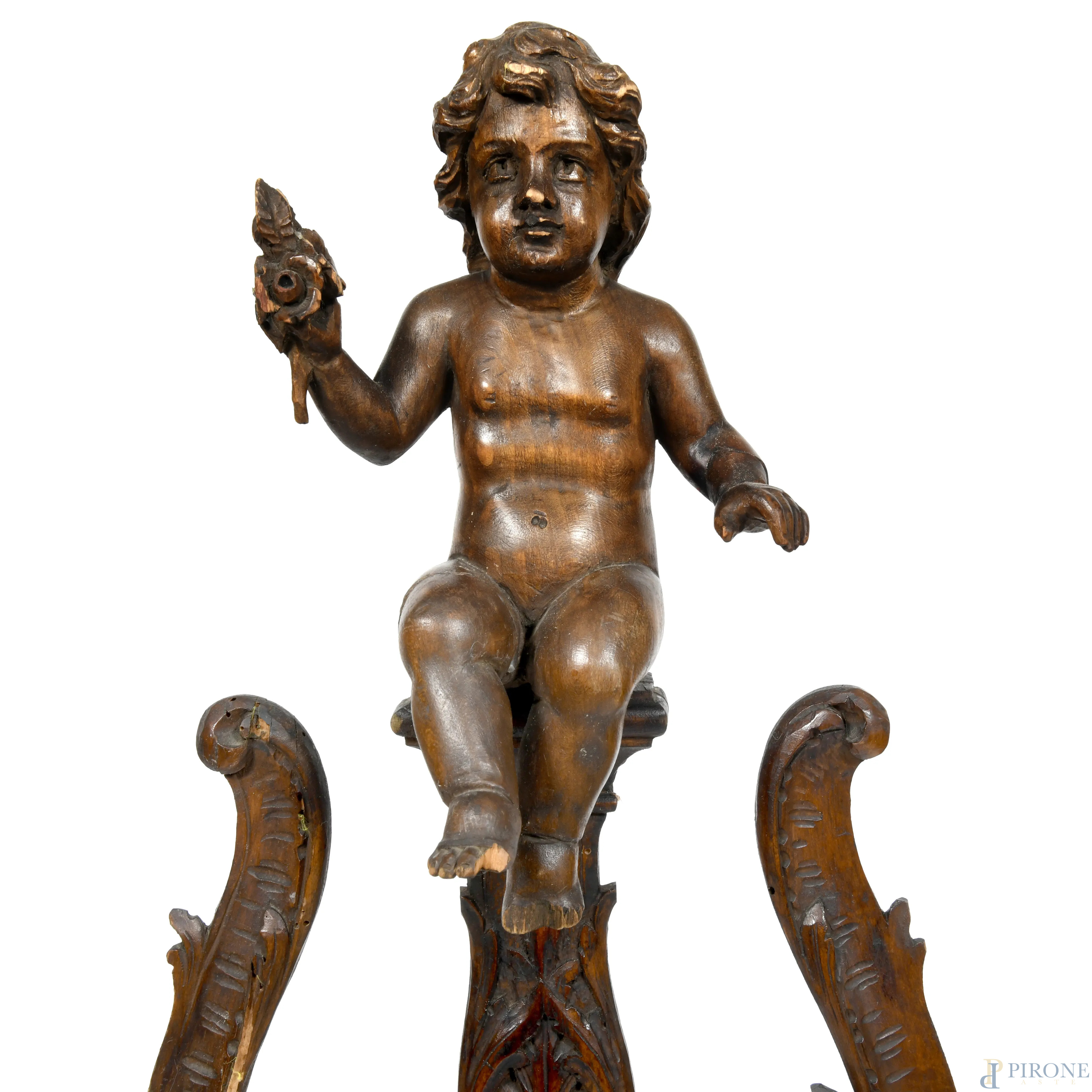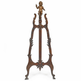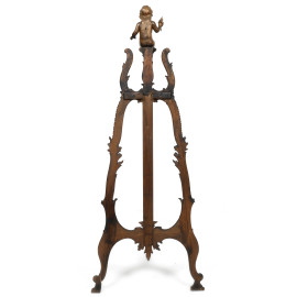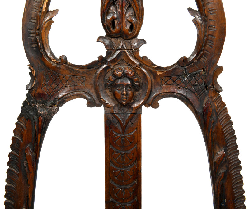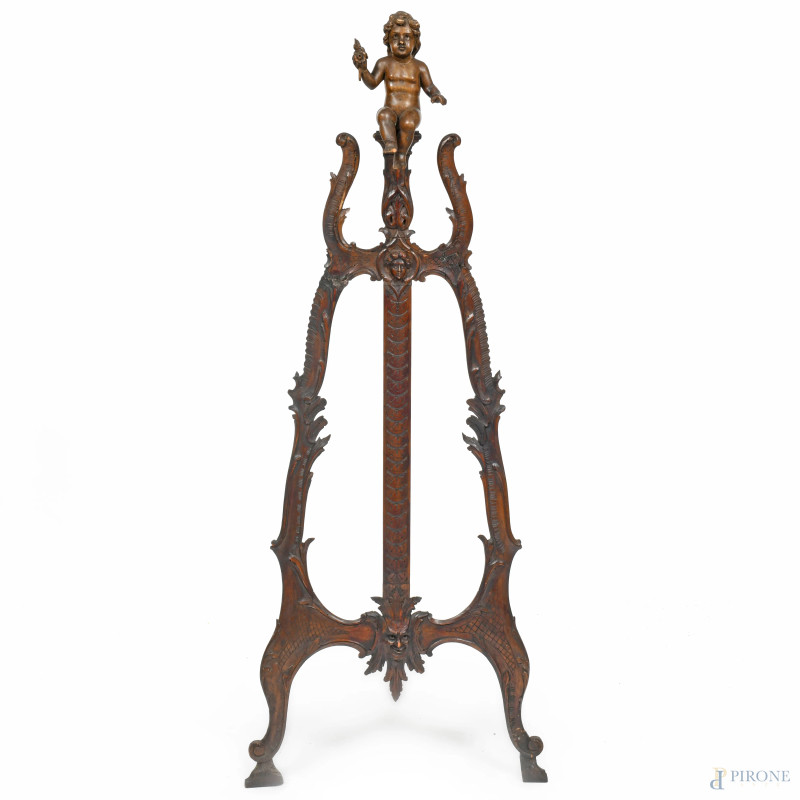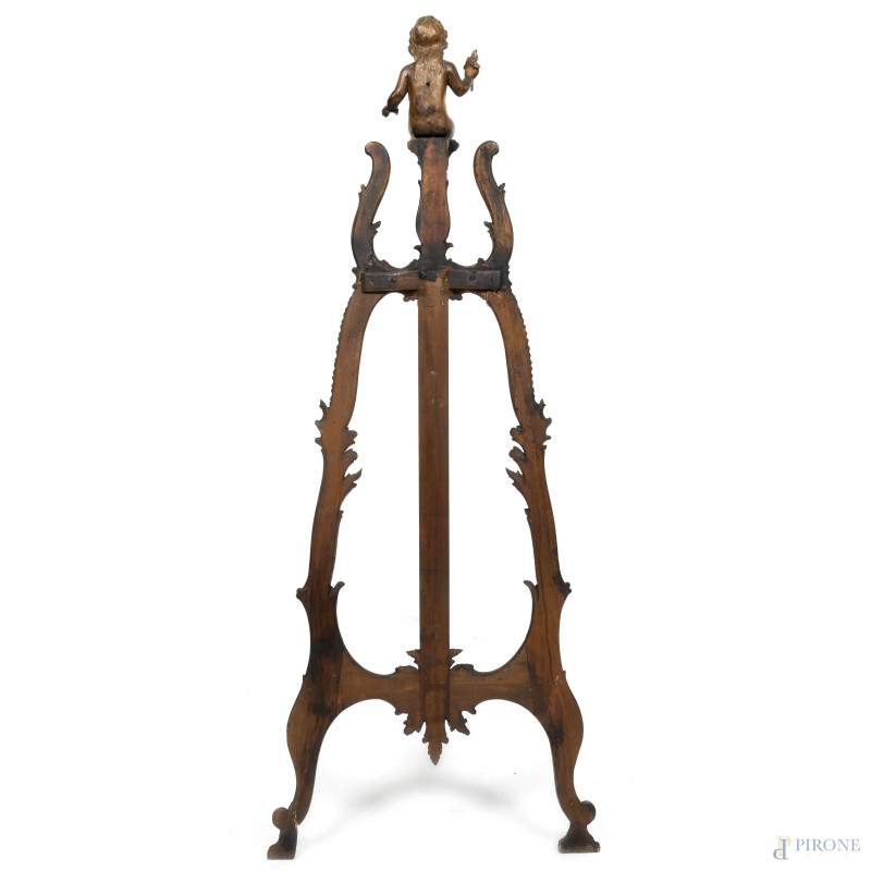 Cavalletto in legno intagliato con scultura apicale di putto, XX secolo, altezza cm 147, (segni di usura, difetti, restauri, rotture, mancanze)
