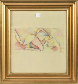 Composizione astratta, XX secolo, tecnica mista su carta, cm 40x36, firmato in basso a sinistra, entro cornice, (ondulazioni della carta)