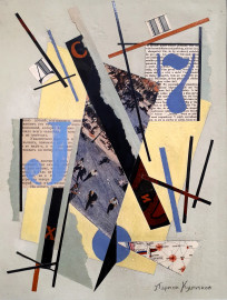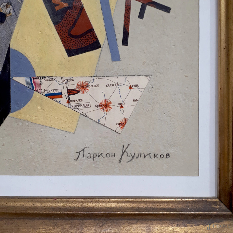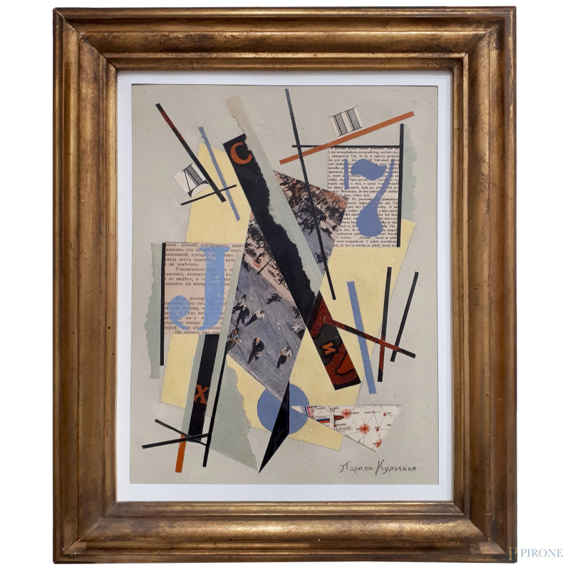 Composizione geometrica di Avanguardia Russa, tecnica mista su cartone, cm 34x26, firmato Larion Kulikov in caratteri cirillici, con cornice