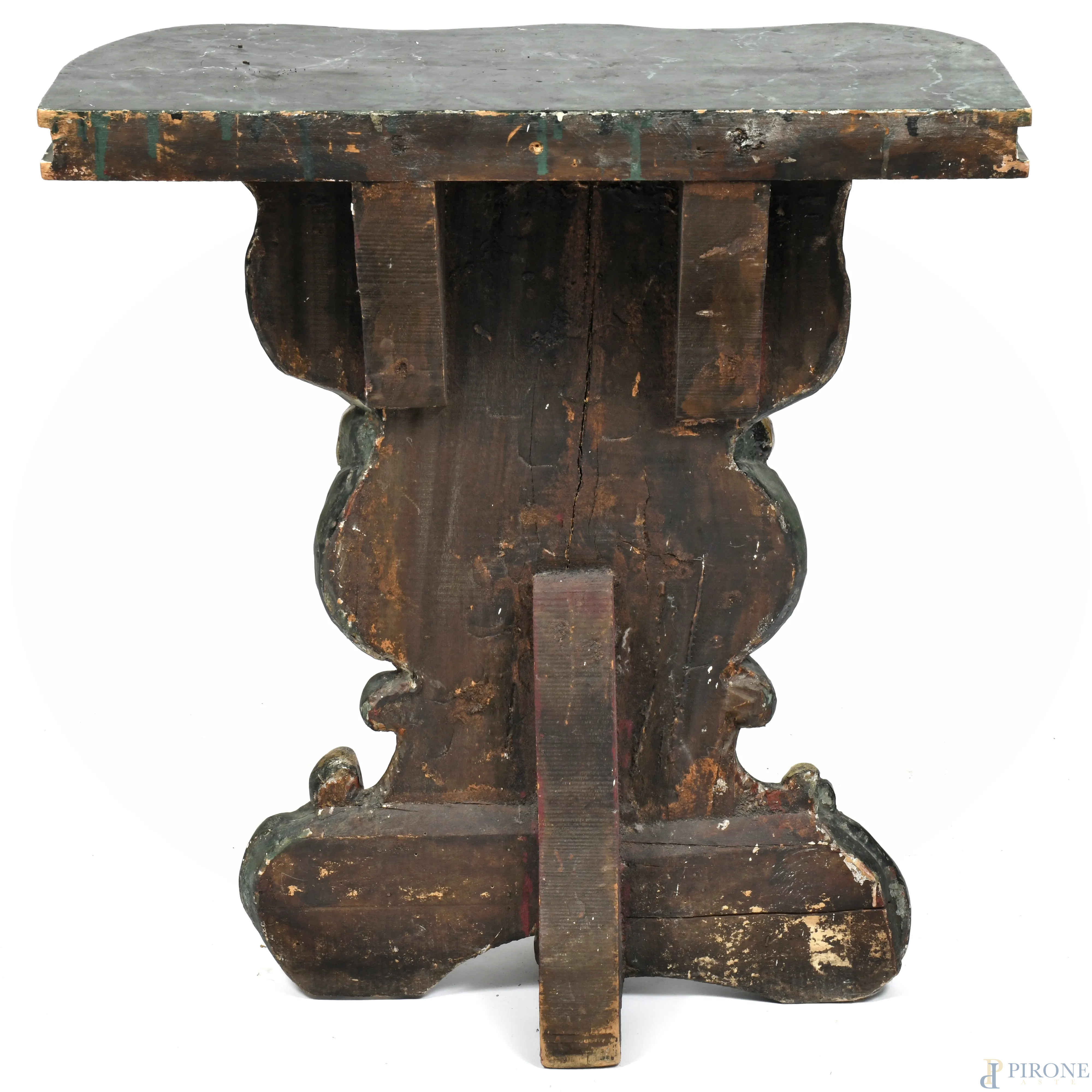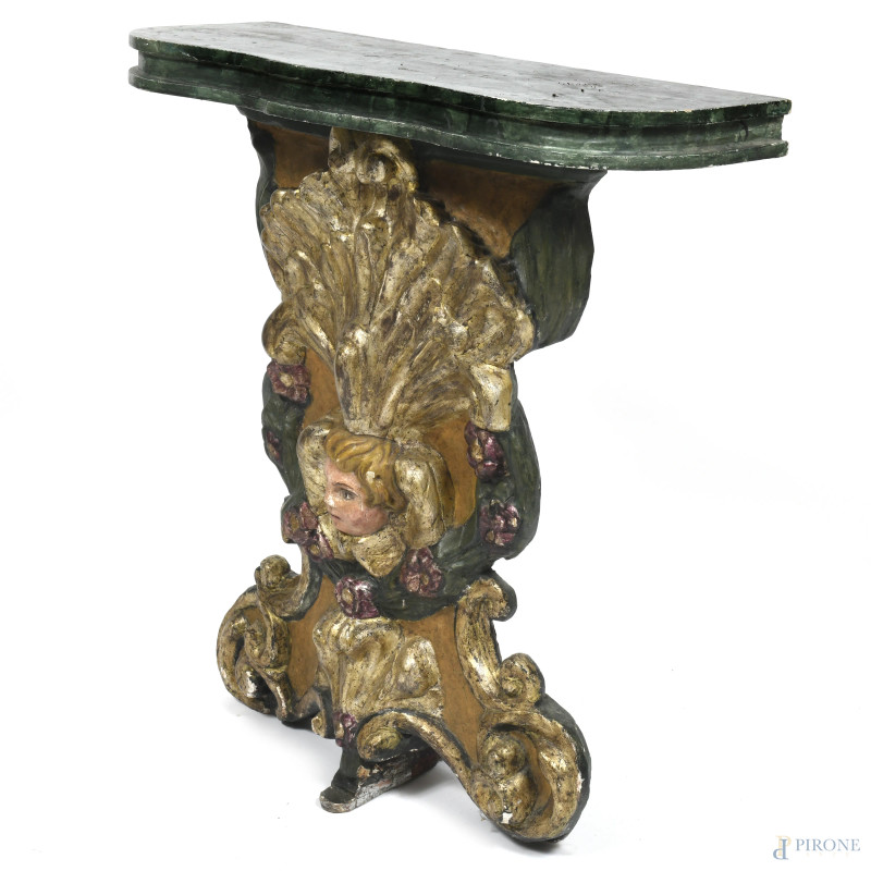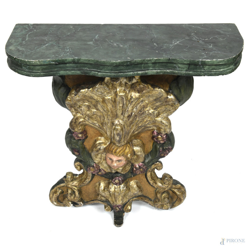 Consolle in legno dipinto e dorato con piano sagomato e fusto intagliato a volute vegetali e floreali con testa di putto, XX secolo, cm 91x81x30, (segni di usura, difetti, scalfiture, fessurazioni)