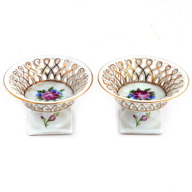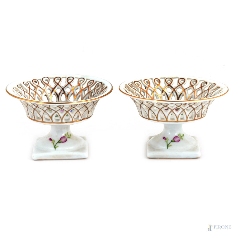 Coppia di alzatine traforate in porcellana Sevres nei toni del bianco e dell'oro con rose al cavetto, XX secolo, altezza massima cm 6,5, (segni di usura, rotture, restauri)