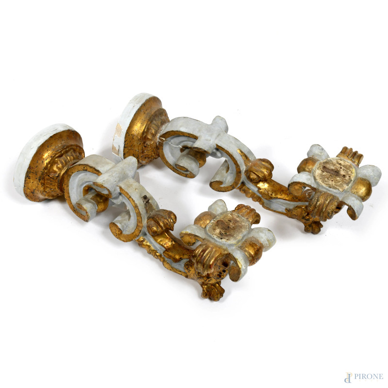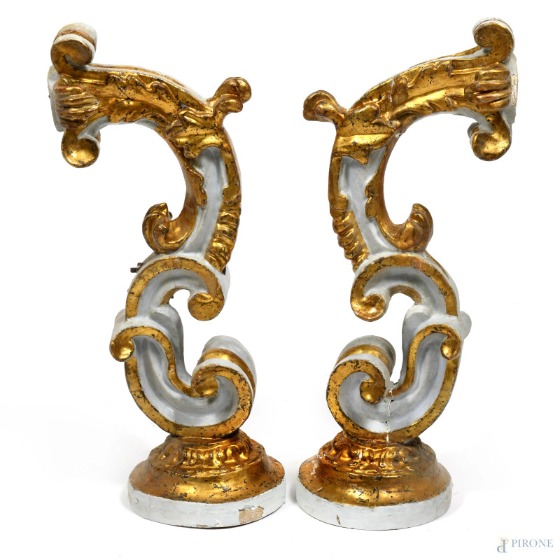 Coppia di appliques in legno laccato e dorato, XX secolo, altezza cm 57, (segni di usura, perdita di doratura, difetti, restauri)