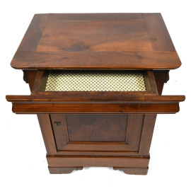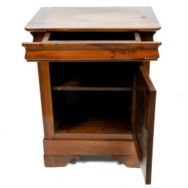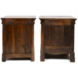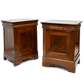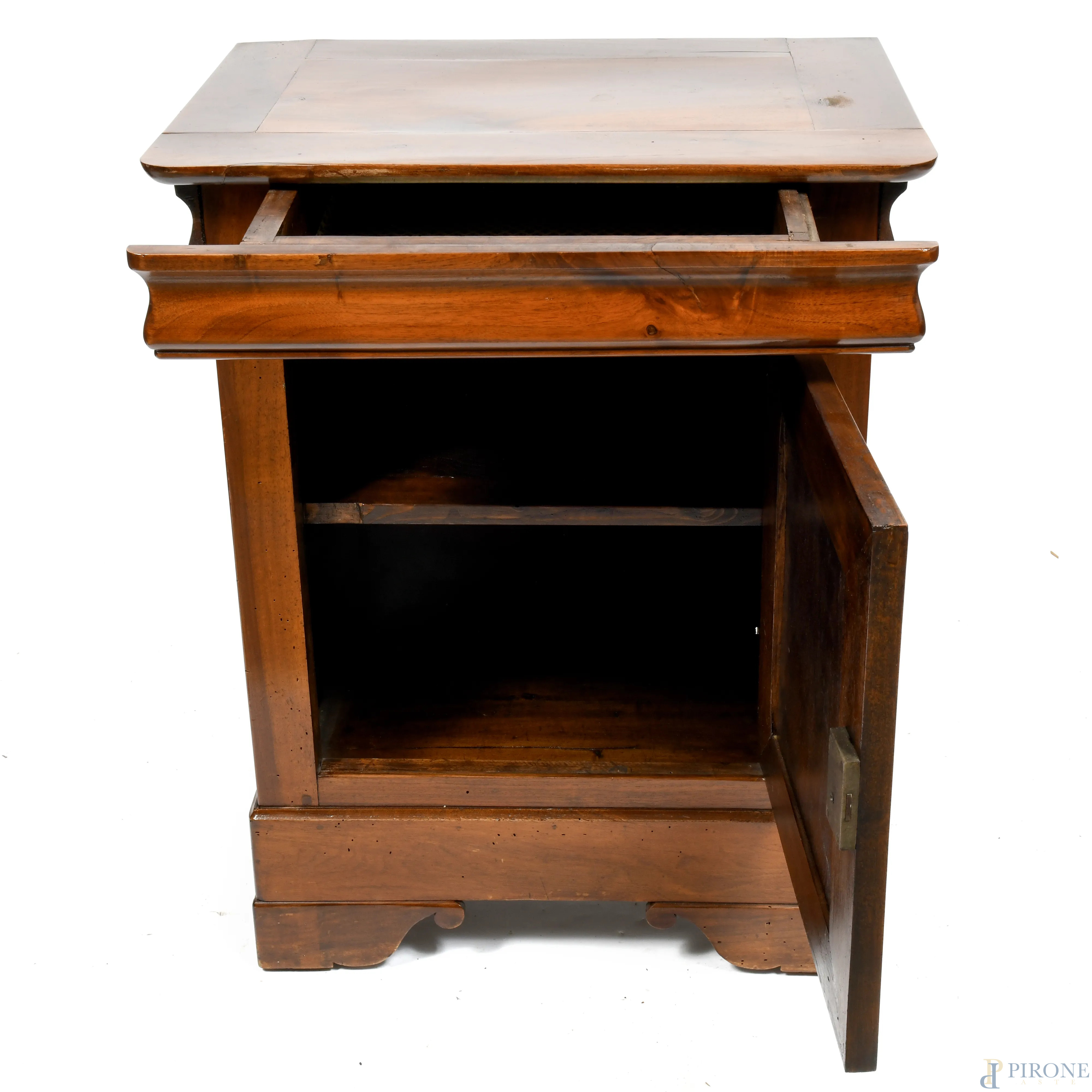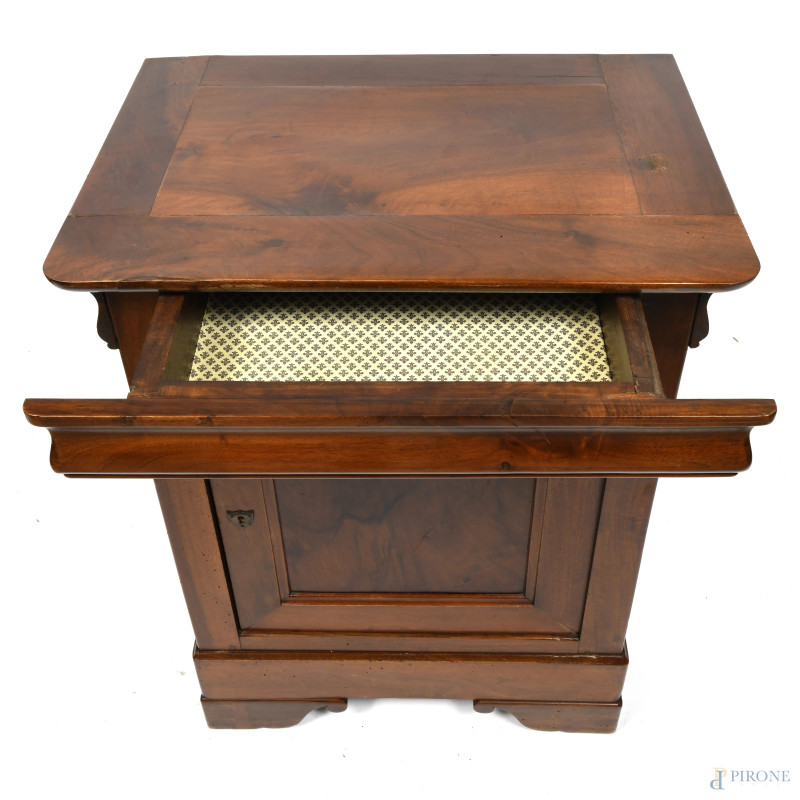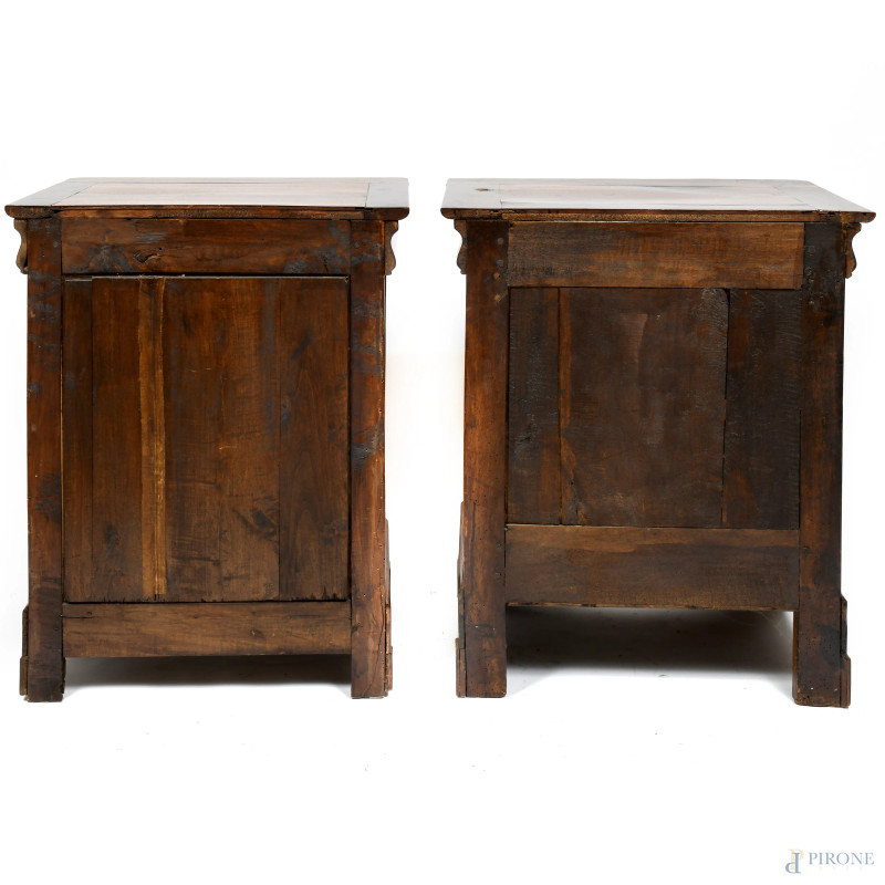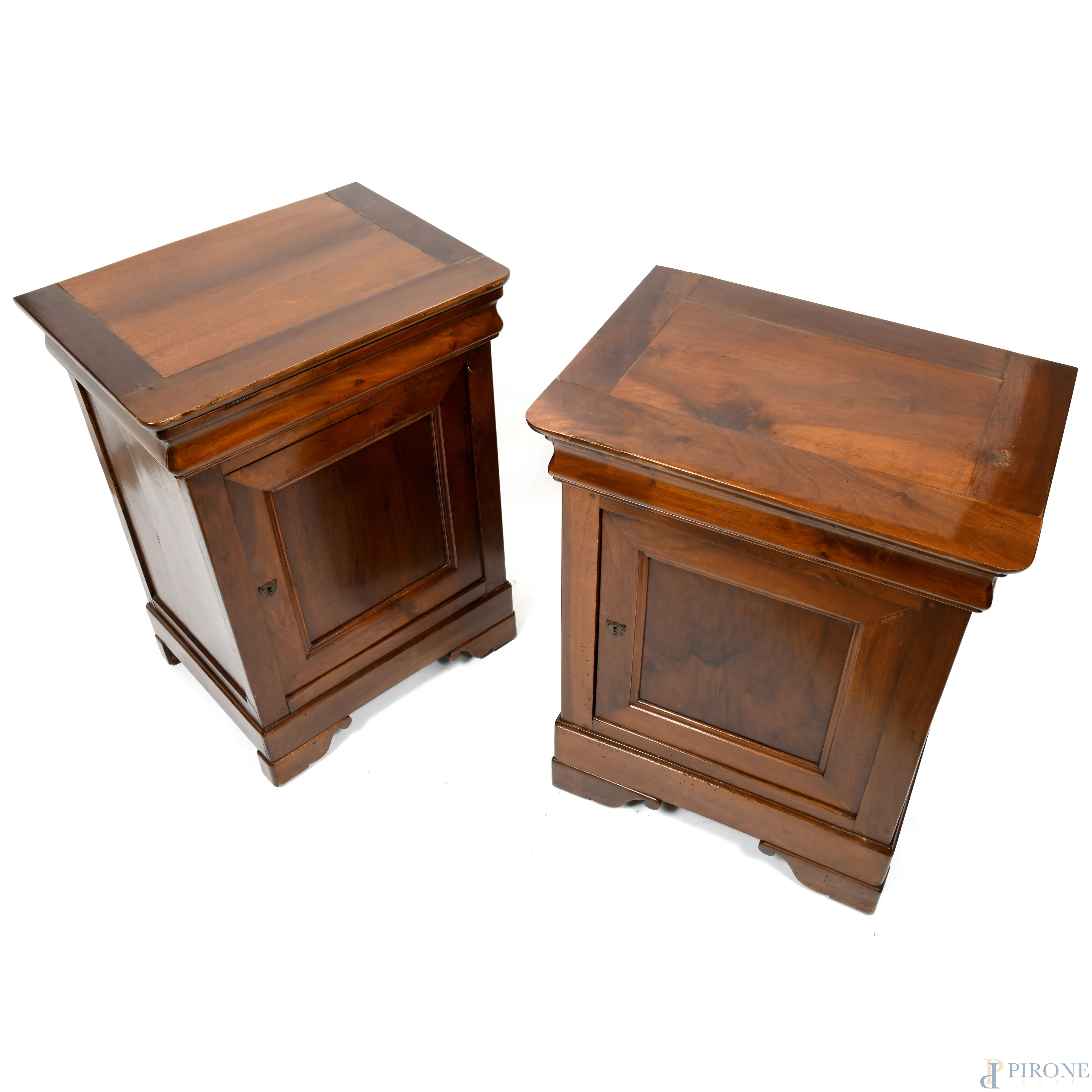 Coppia di comodini in noce con vano a sportello e piedi a mensola, cm 88x 63x46, (segni di usura, graffi, difetti)