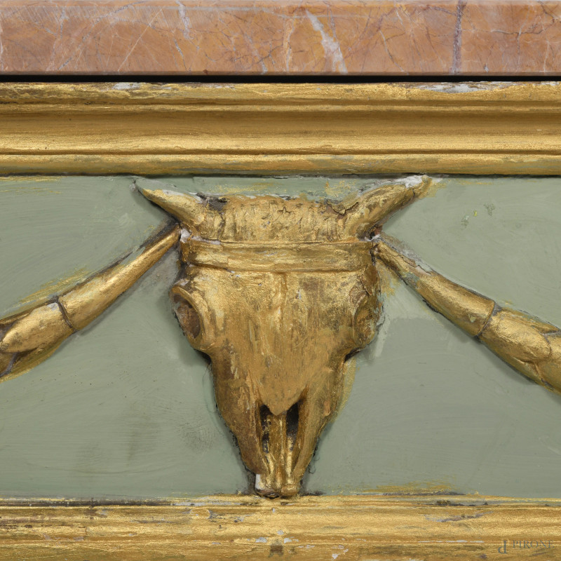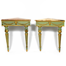 Coppia di consoline ad angolo in legno dipinto e dorato con piano in marmo giallo. Fronte arricchito da festoni e bucrani, XIX-XX secolo, cm 87,5x72x36 (difetti, rotture al piano, restauri, fori di tarlo, mancanze scalfiture)