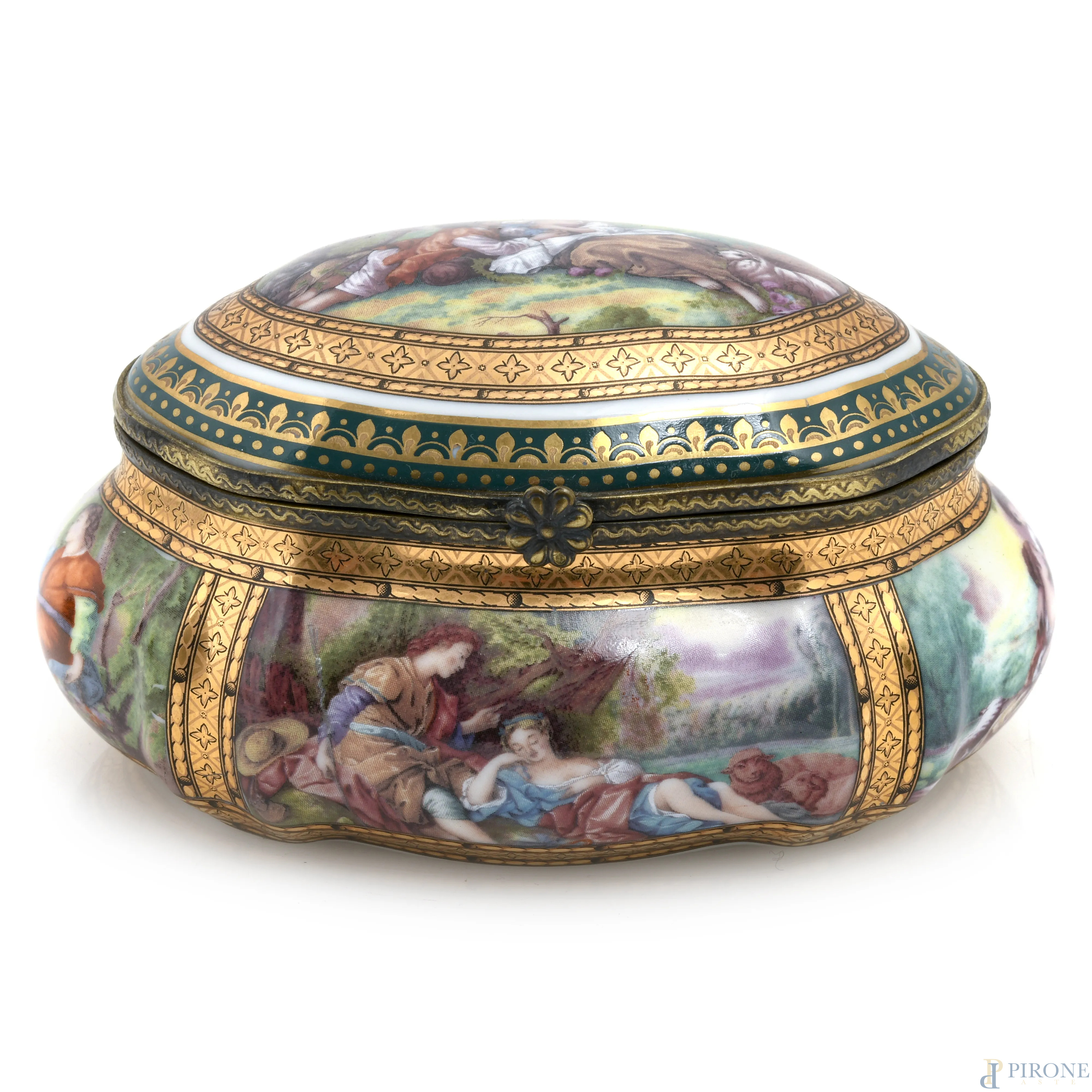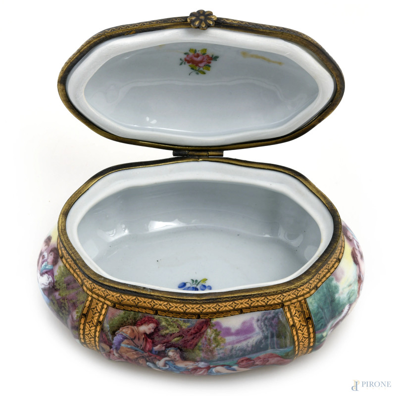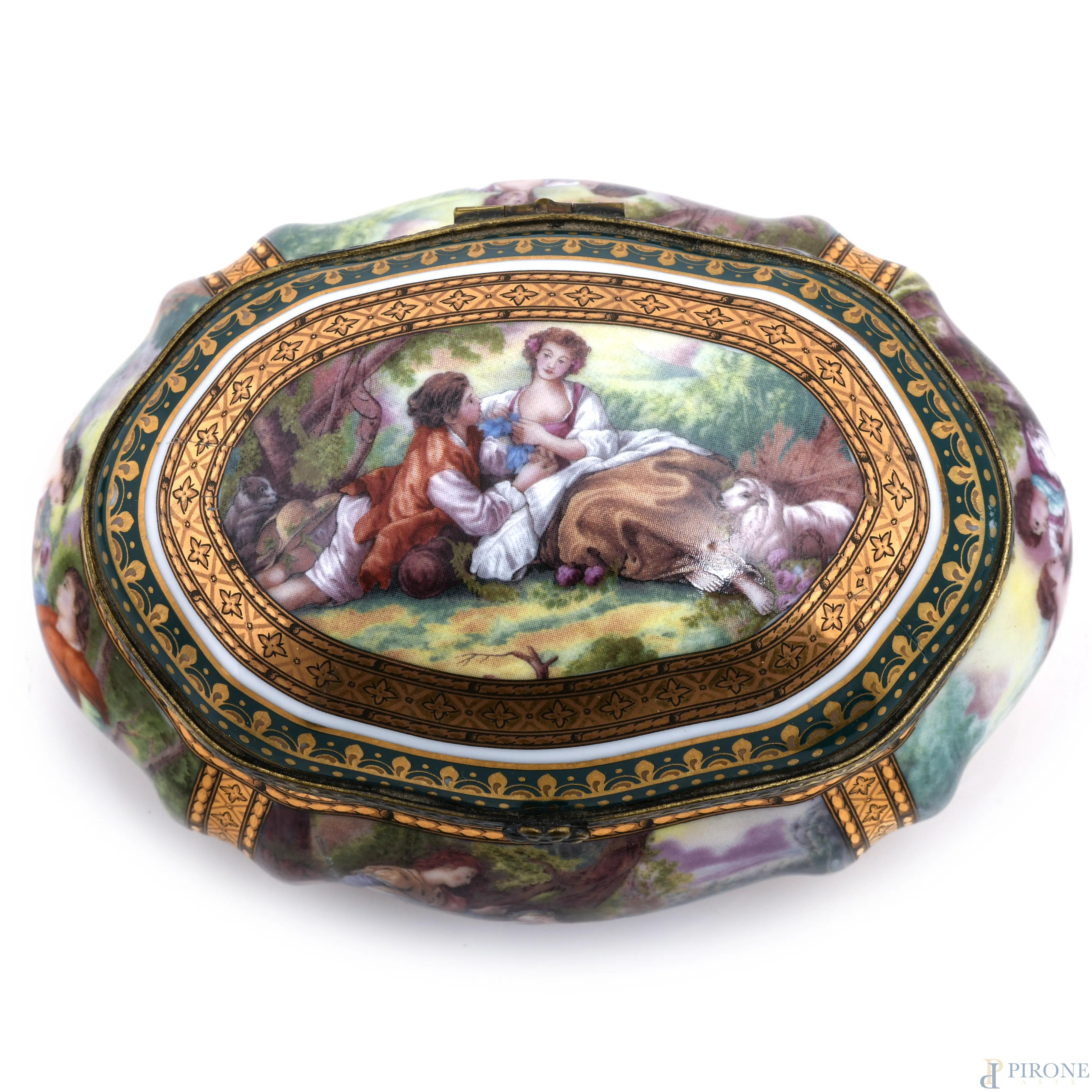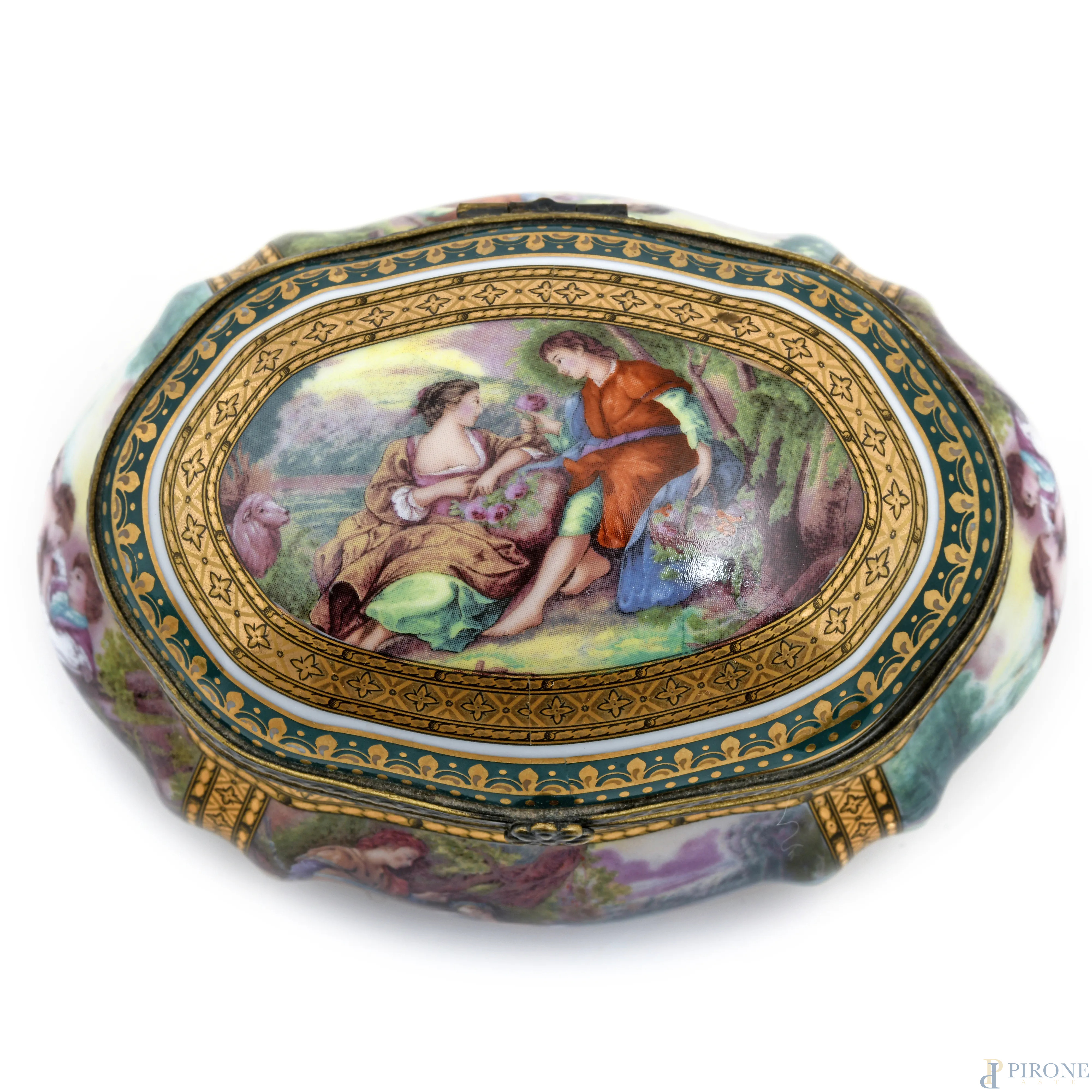 Coppia di due cofanetti in porcellana Meissen decorati in policromia con scene galanti, XX secolo, cm 7x13x9,5, (segni di usura)