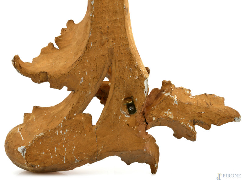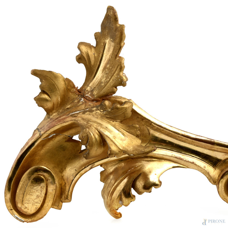 Coppia di elementi decorativi a volute vegetali in legno intagliato e dorato, XX secolo, cm 67,5x29,5, (segni di usura, cadute di doratura, rotture)