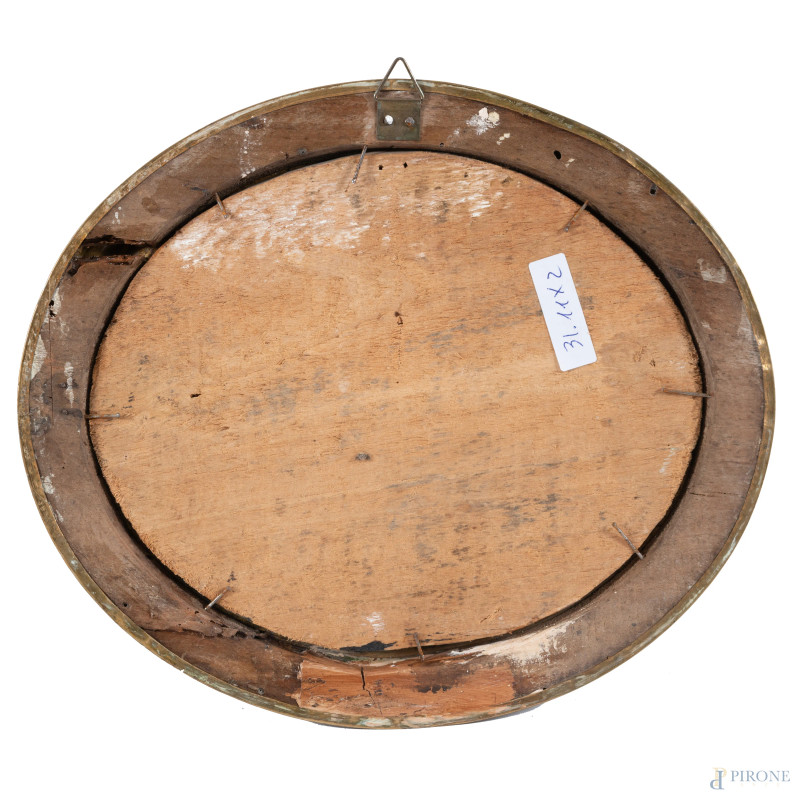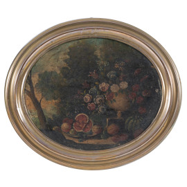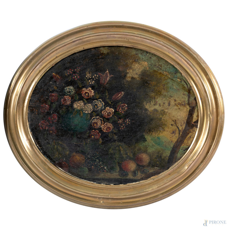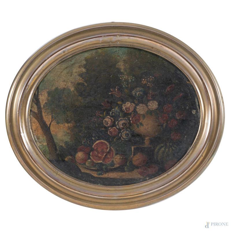 Coppia di nature morte, XIX secolo, olio su tavola a serto ovale, cm 16,5x20, entro cornice, (abrasioni, usura del tempo)