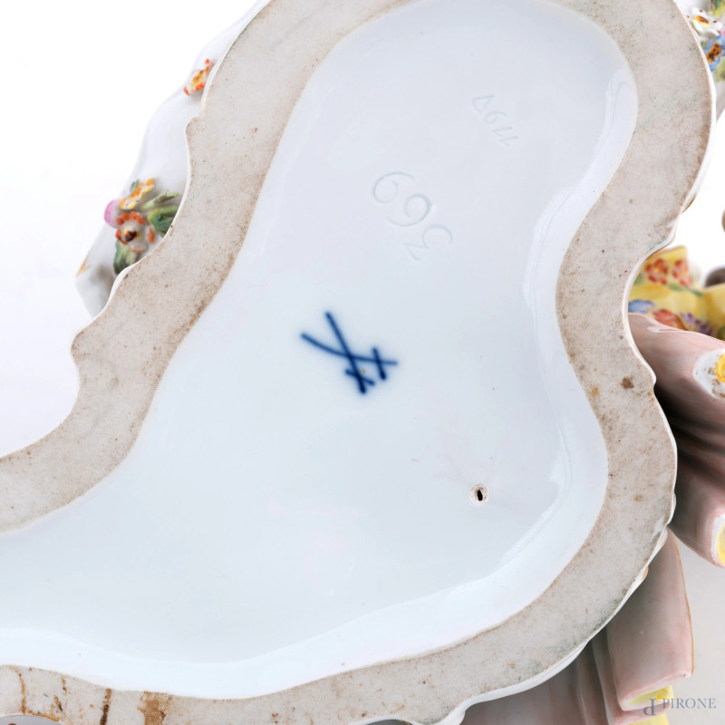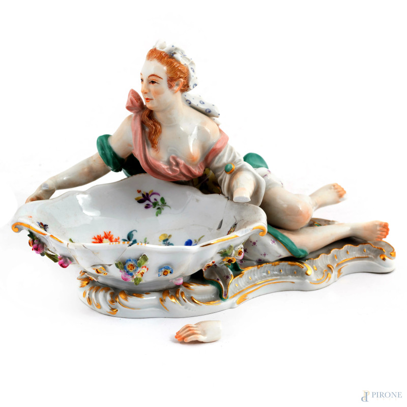 Coppia di saliere in porcellana Meissen decorate in policromia con figura maschile e femminile, XIX-XX secolo, misure massime cm 11,5x20x13,5, (felature, rotture, restauri, difetti)
