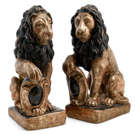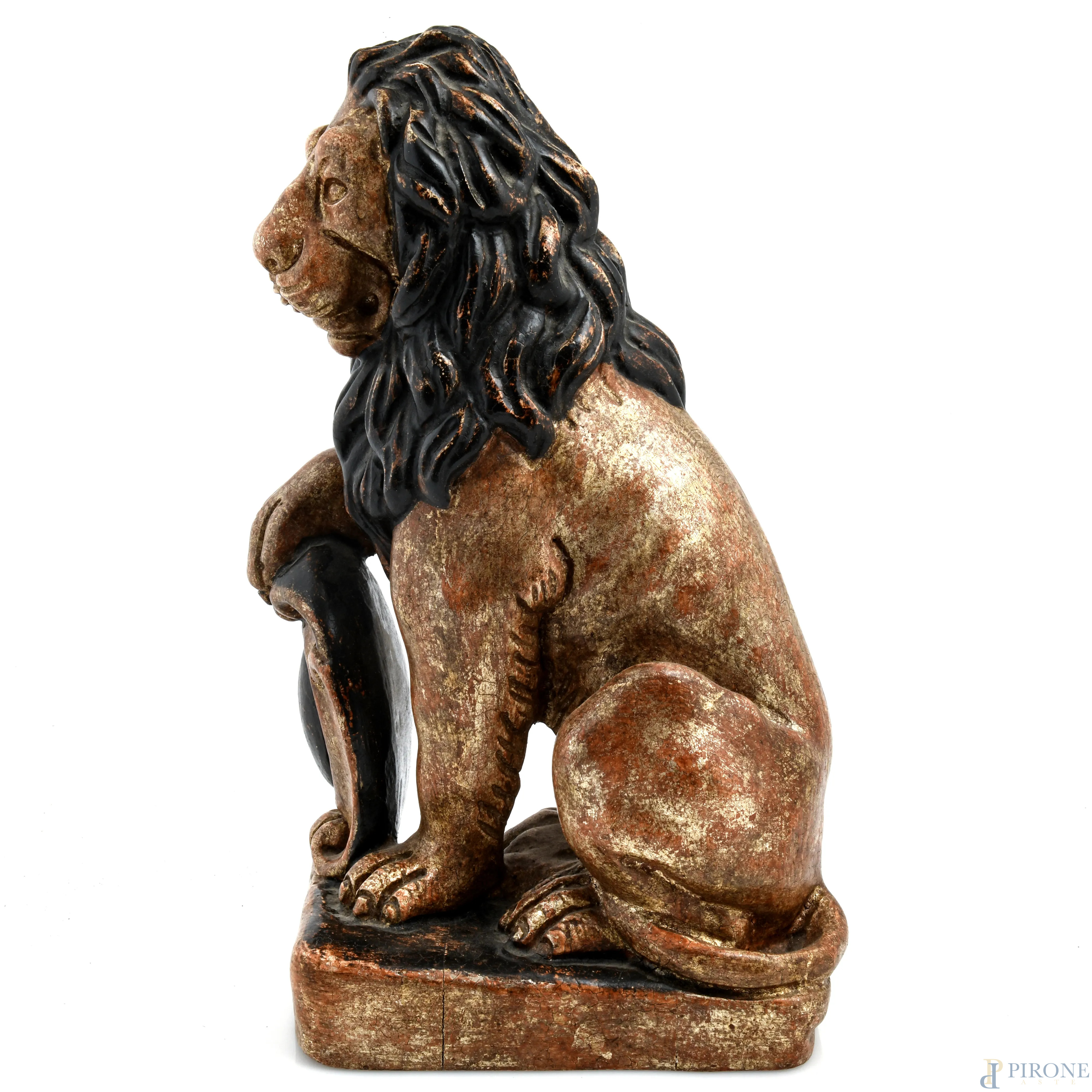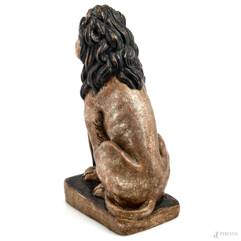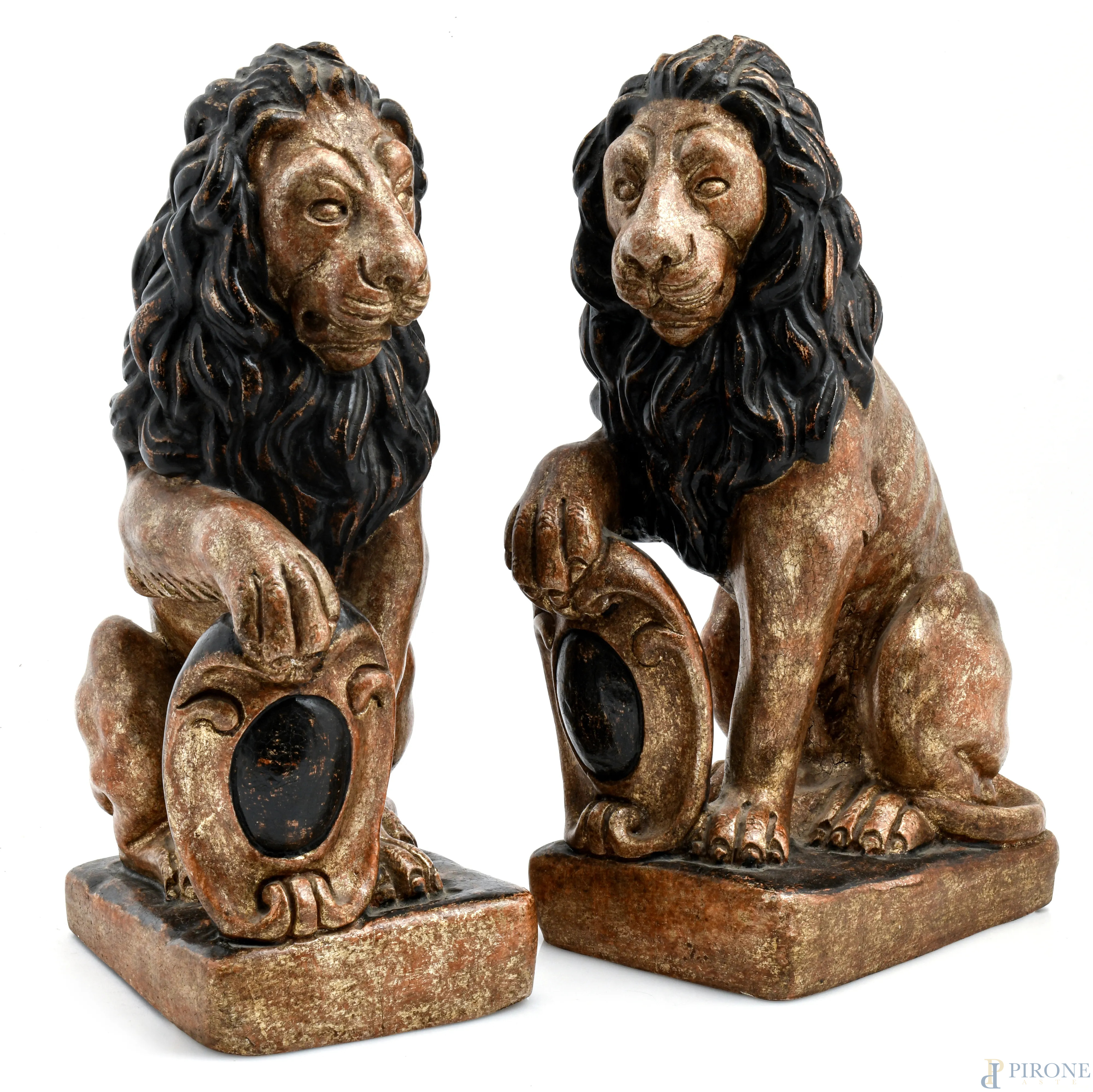 Coppia di sculture in legno dorato raffiguranti leoni, XX secolo, altezza cm 42, (Segni di usura, scalfiture, fessurazioni, difetti)