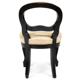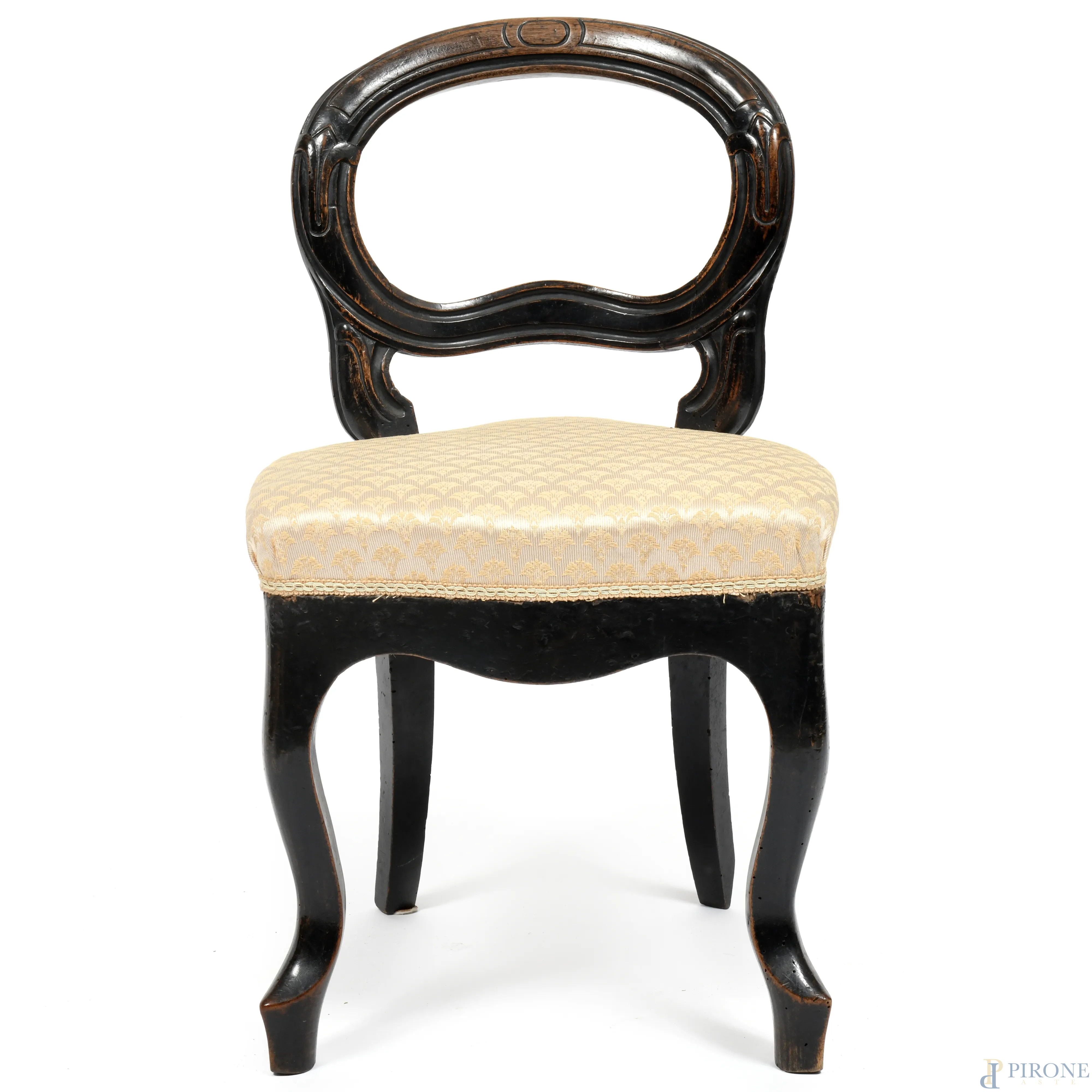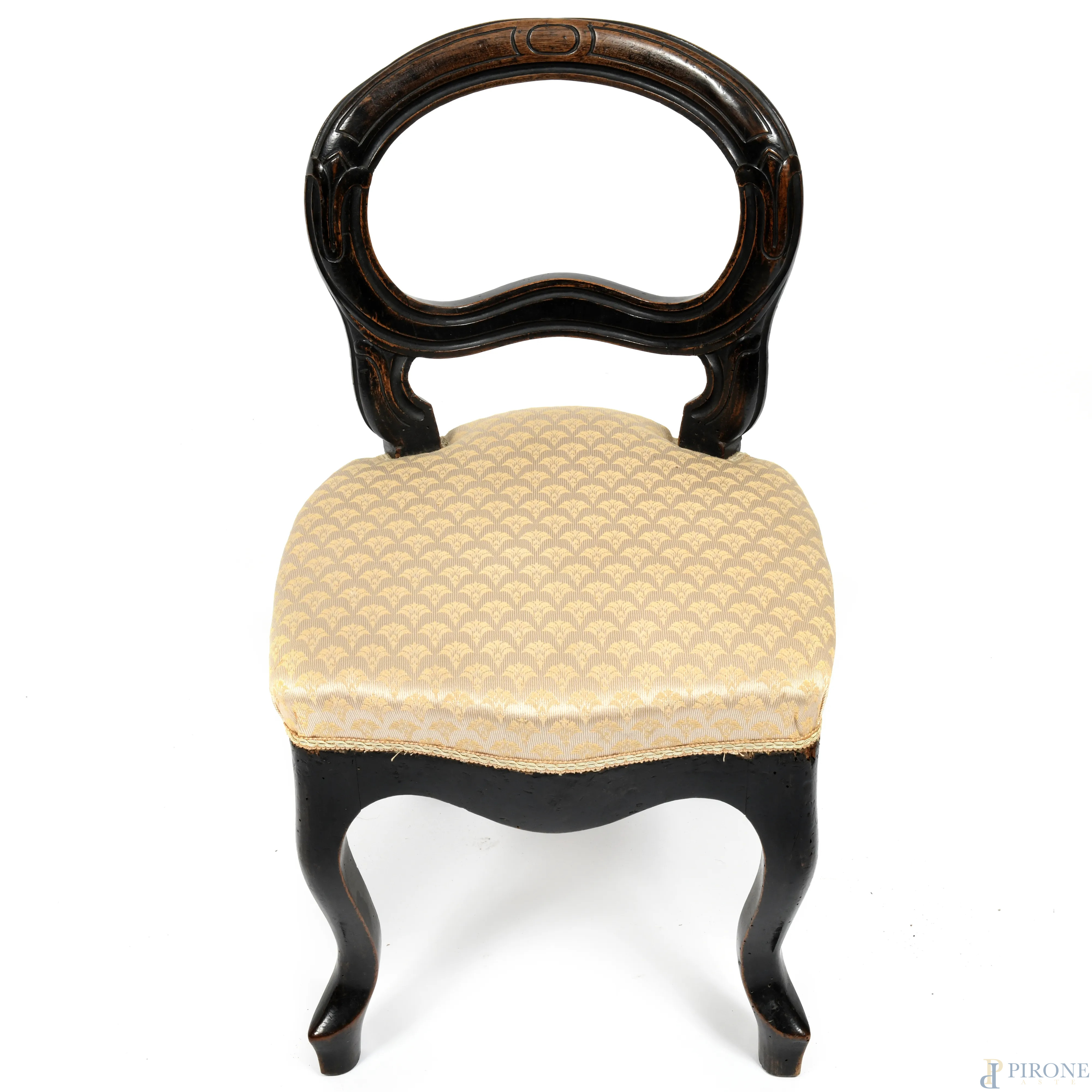 Coppia di sedioline in noce tinto con gambe anteriori mosse. Seduta rivestita in tessuto panna e oro, XX secolo, cm 74,5x43x45, (segni di usura, difetti, fori di tarlo, umidità)