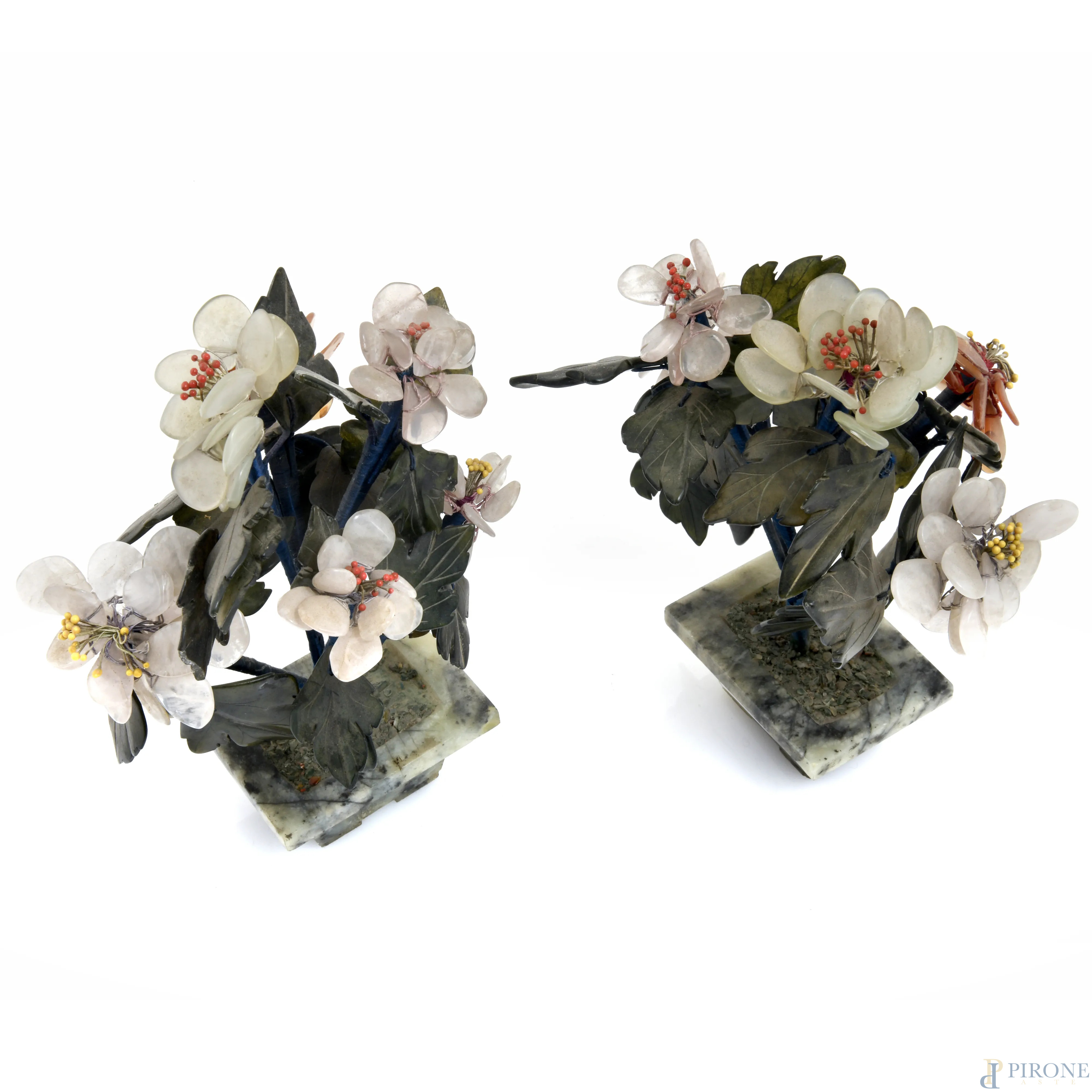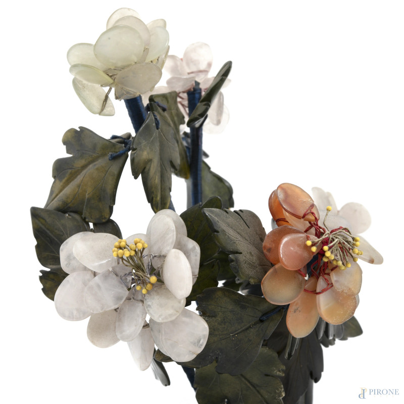 Coppia di vasi di fiori in pietre e materiali vari, misure massime cm 20, (segni di usura)