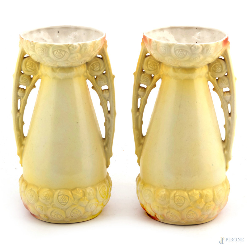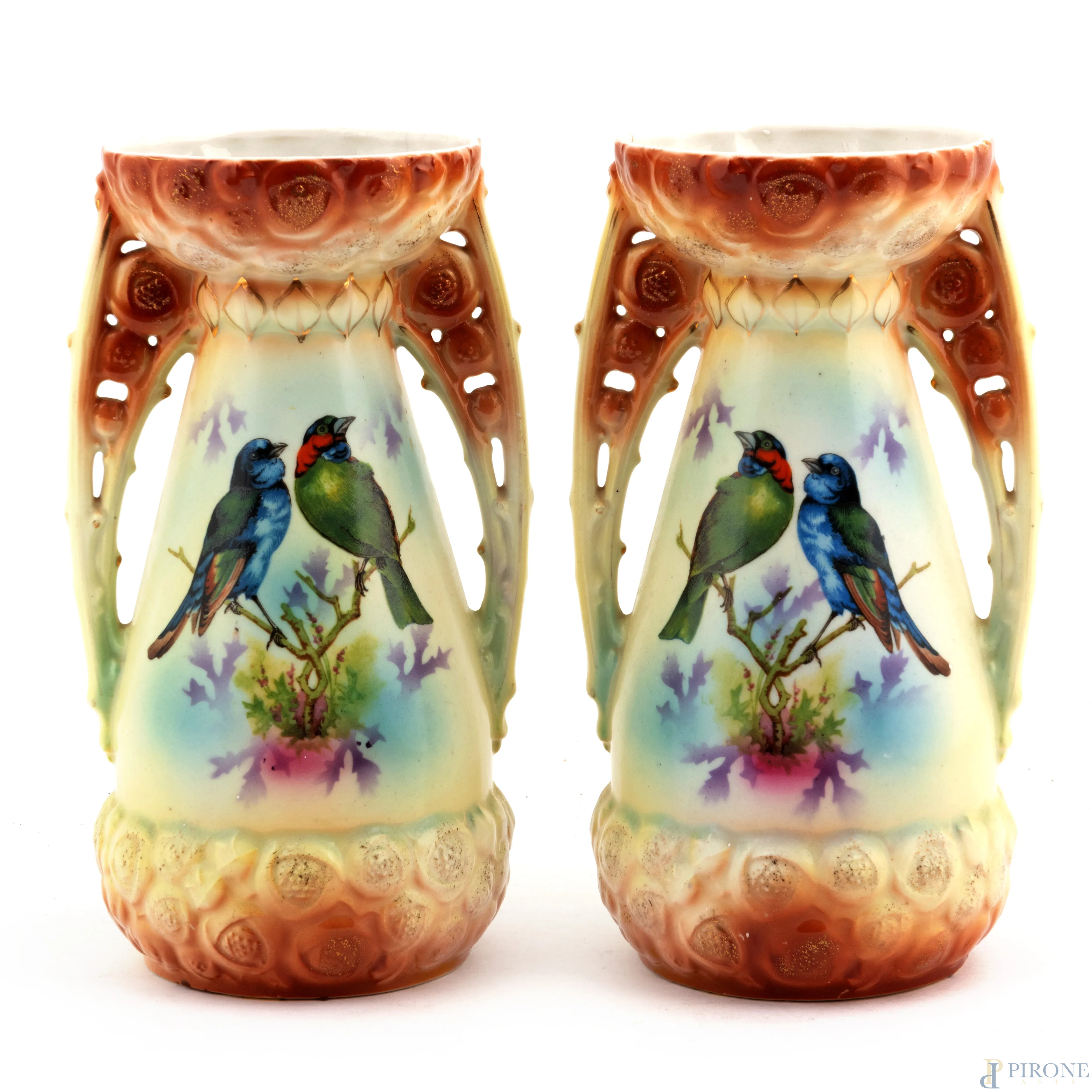 Coppia di vasi in porcellana nei toni del marrone e del verde decorati con raffigurazioni di volatili, XX secolo, altezza cm 25, (segni di usura, difetti)
