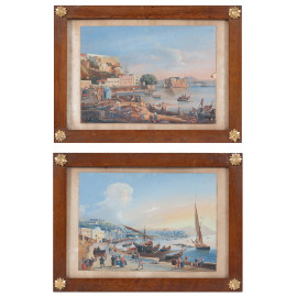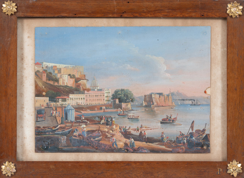 Coppia di vedute di Napoli, XIX secolo, tecnica mista su carta, cm 19,5x27, entro cornice, (lievi tracce di umidità, lacerazioni)